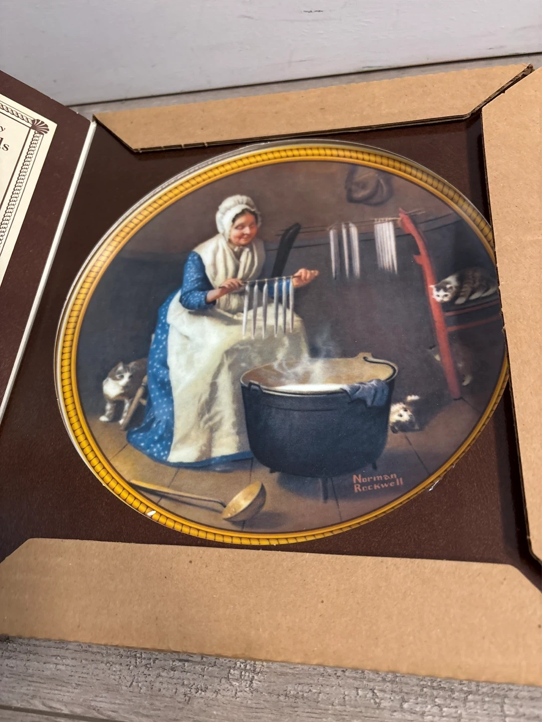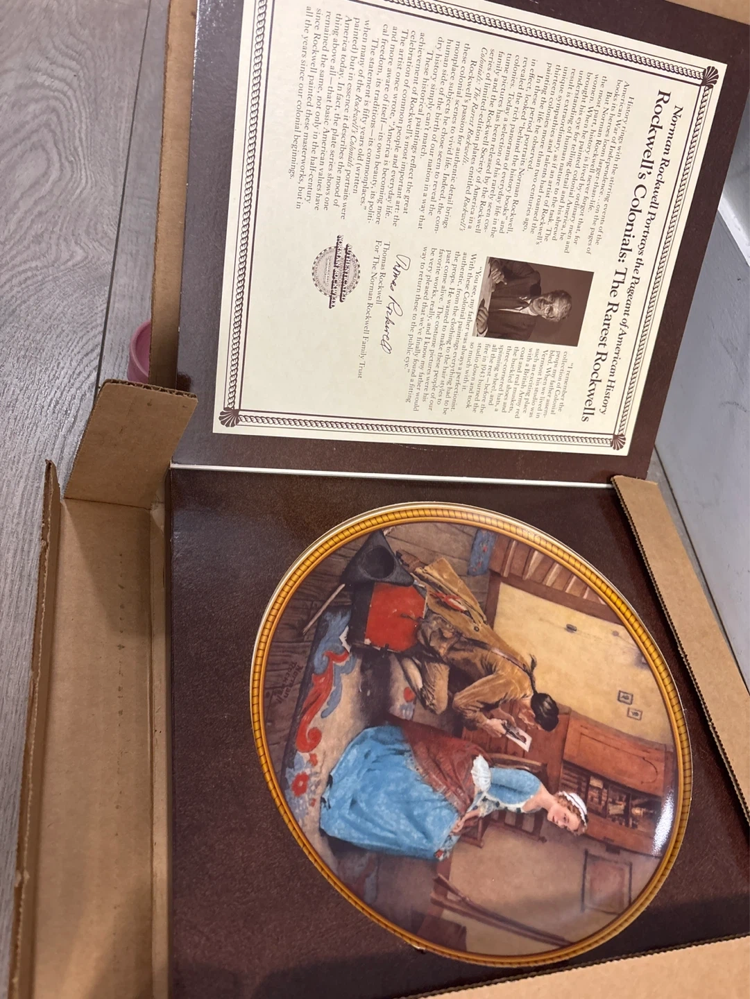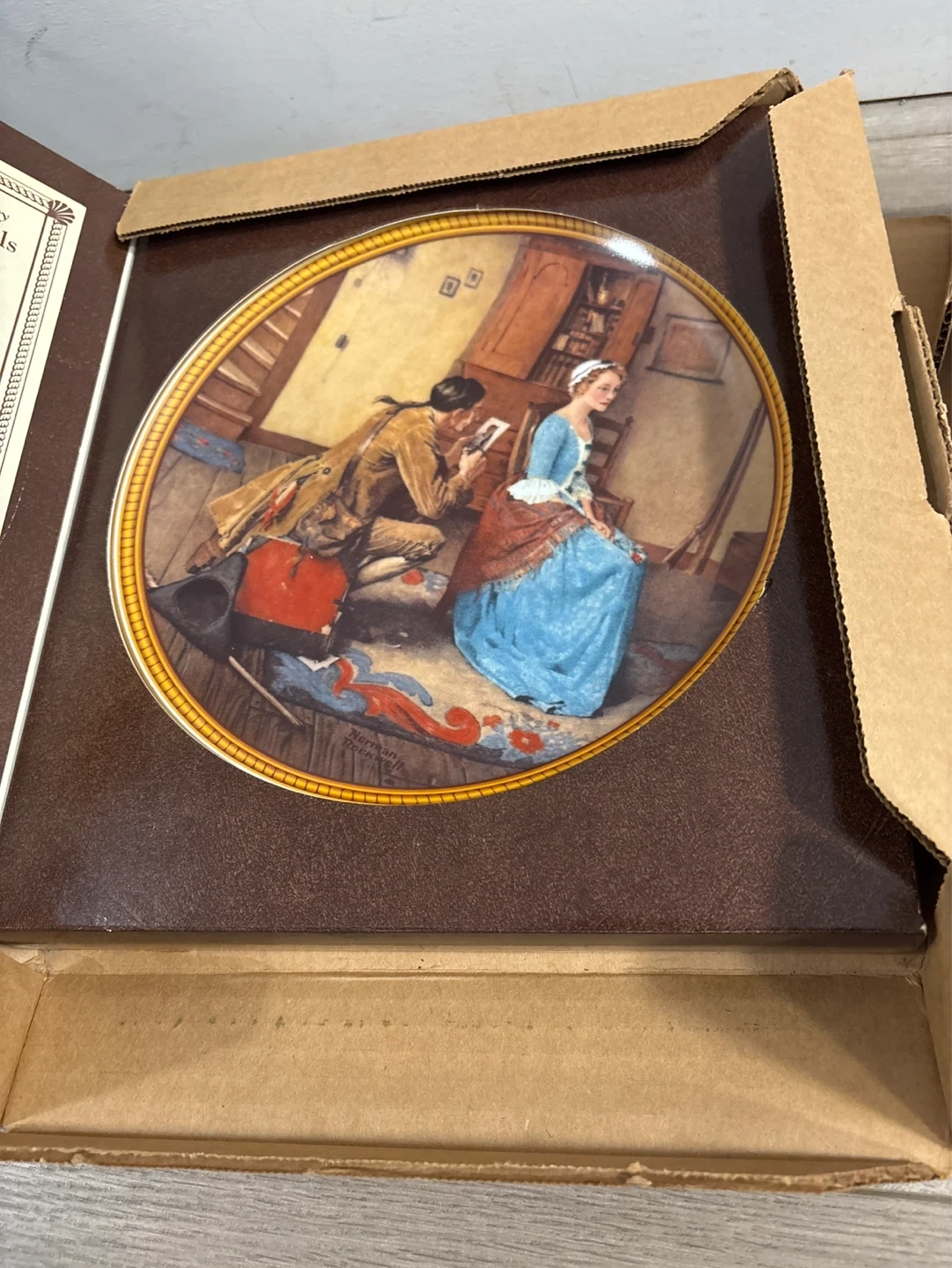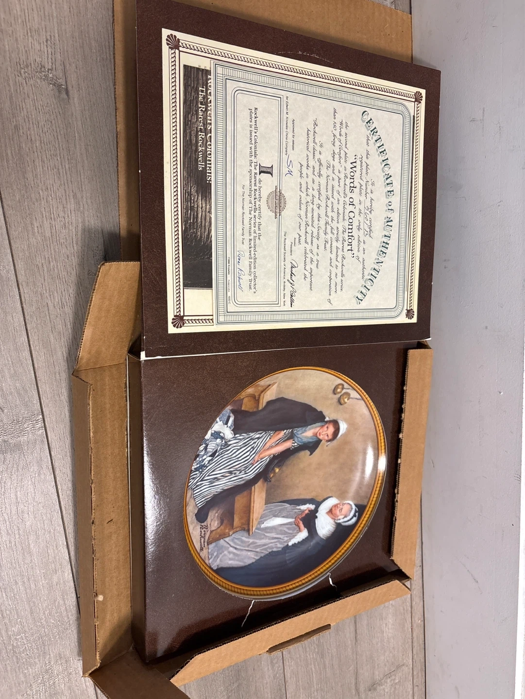 This is the "Words of Comfort" collector plate by Edwin M. Knowles. It's part of the "Norman Rockwell's Colonialists" series. The plate comes with its original certificate of authenticity. This piece would appeal to collectors of Rockwell's art.
