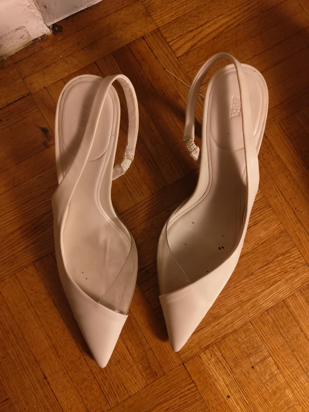 These Zara slingback heels are a chic white colour. They feature a pointed toe and a clear panel. The elasticated strap ensures a secure fit. Perfect for dressing up or down!