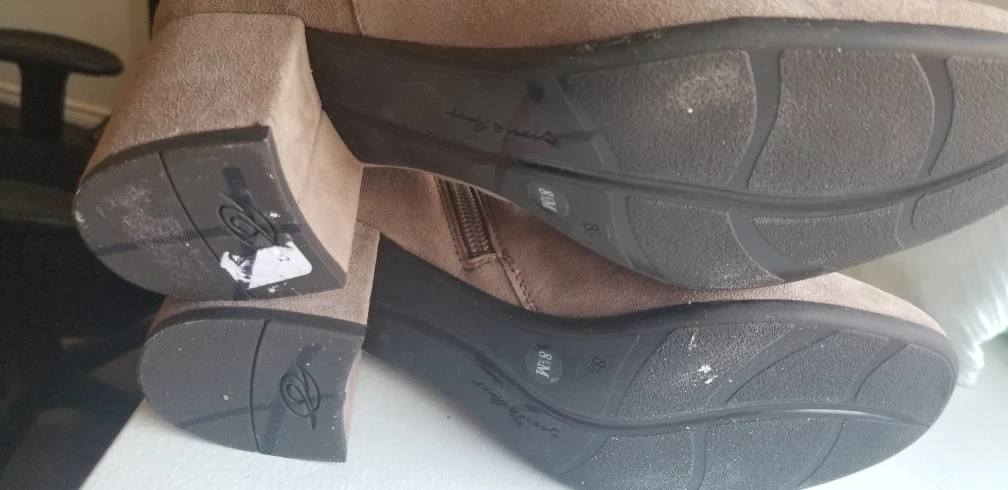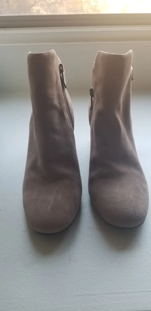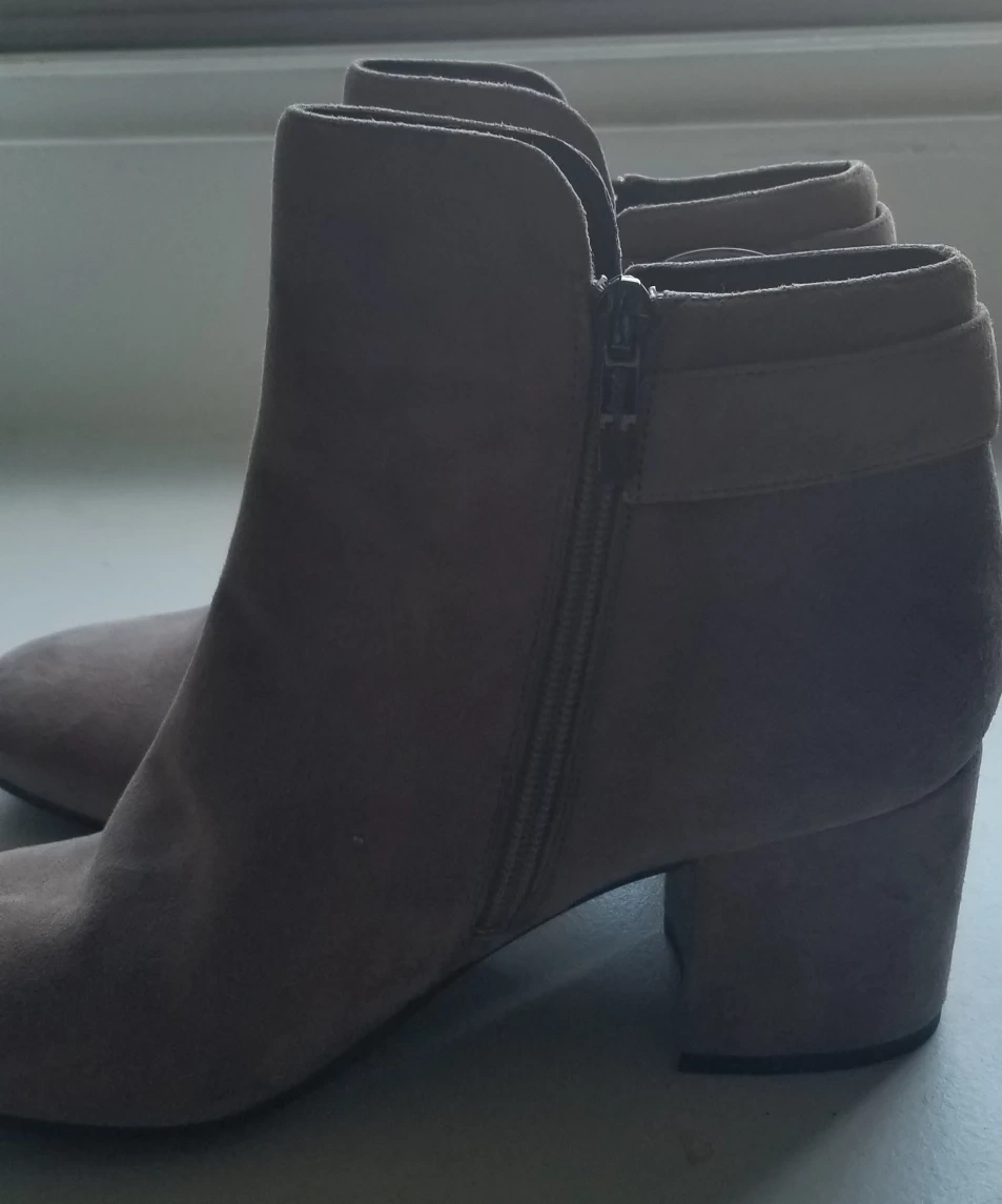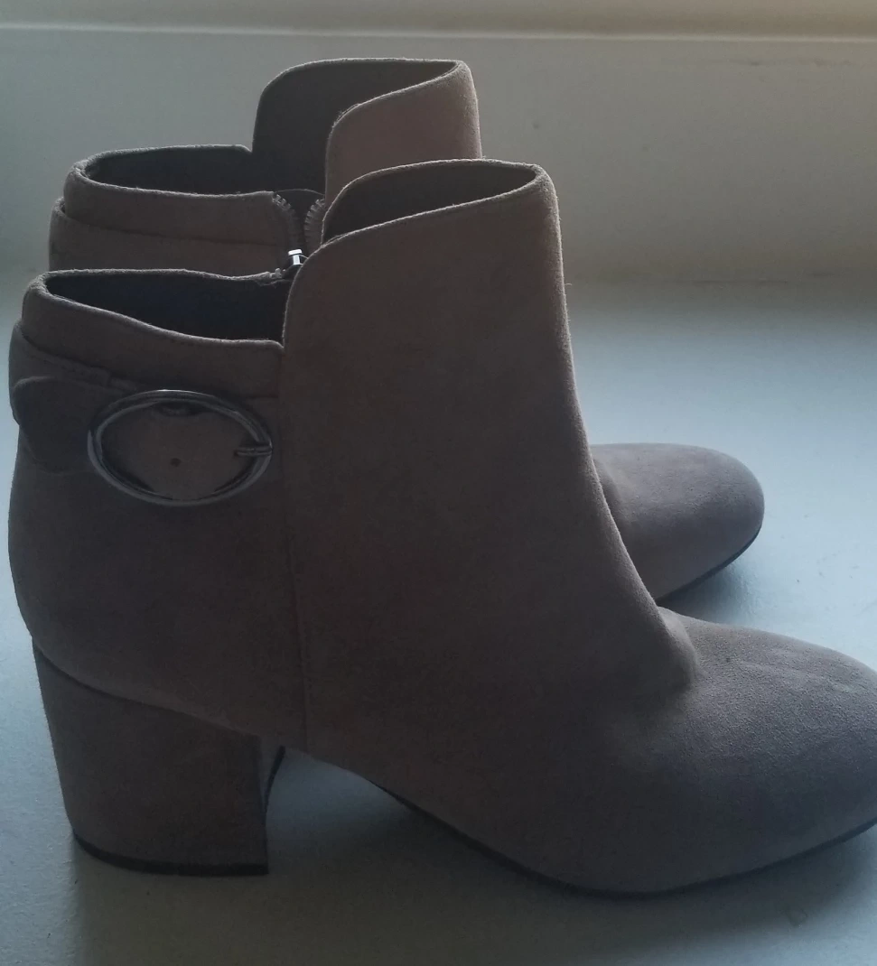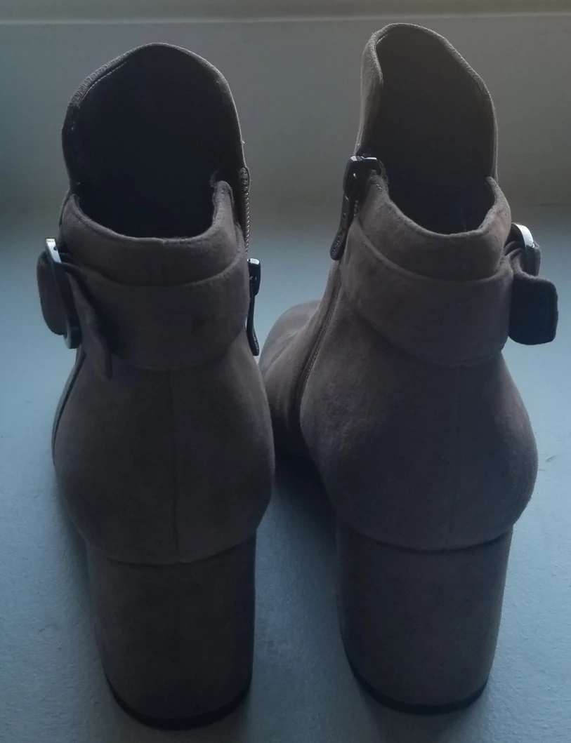 158Grey suede ankle boots with a buckle detail, side zipper, and a block heel.