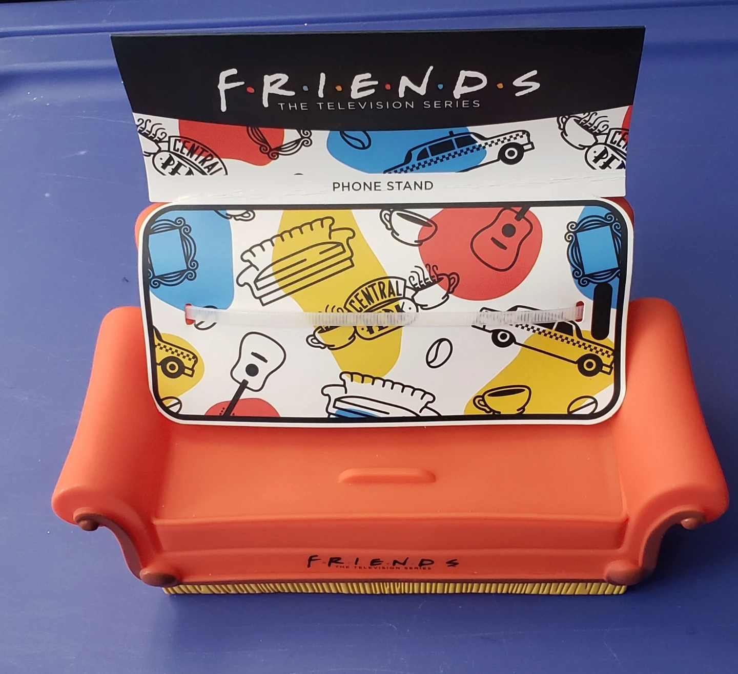 This phone stand is designed like the iconic couch from the Friends TV series' Central Perk cafe. It supports various iPhone and Android models. The stand features a colorful graphic insert with motifs from the show. Brand new, cash only pickup in Queens NY