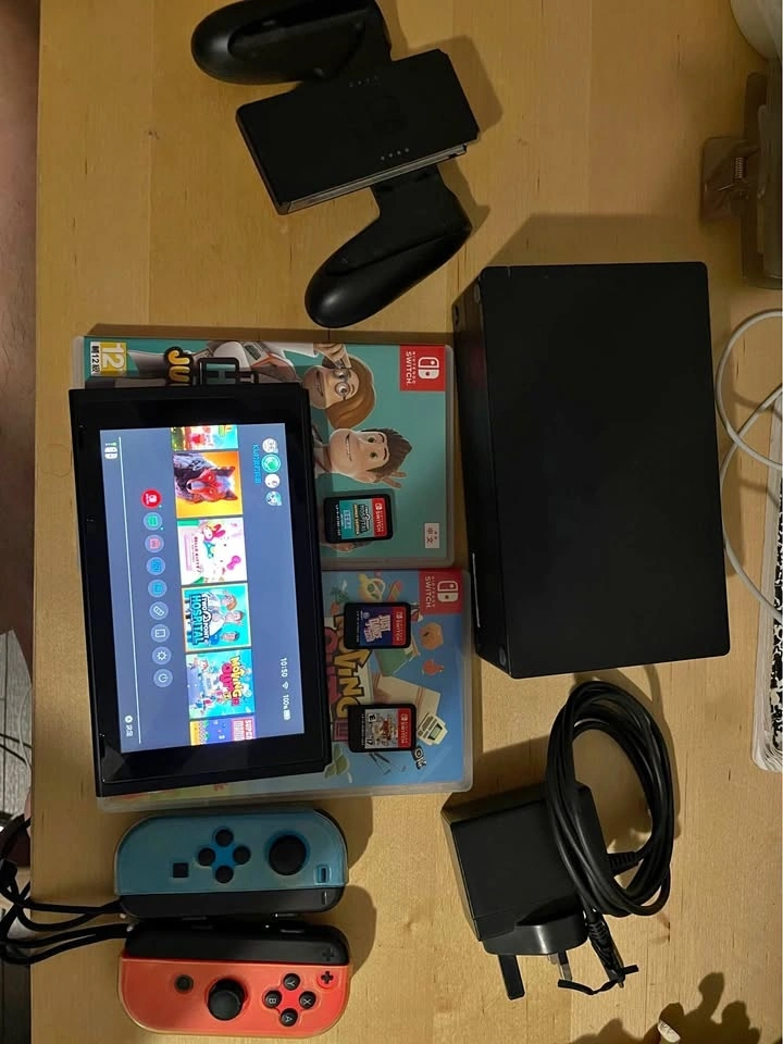 Nintendo Switch console (Model HAC-001) in fully working condition. No major damage or scratches, comes with a cover. Includes: Nintendo Switch console, Dock, Red & Blue Joy-Cons, Joy-Con grip, and 3-pin charger. Games included: Just Dance 2020, Moving Out, and Two Point Hospital. Everything works perfectly. Pickup in Kennedy/Sheppard.