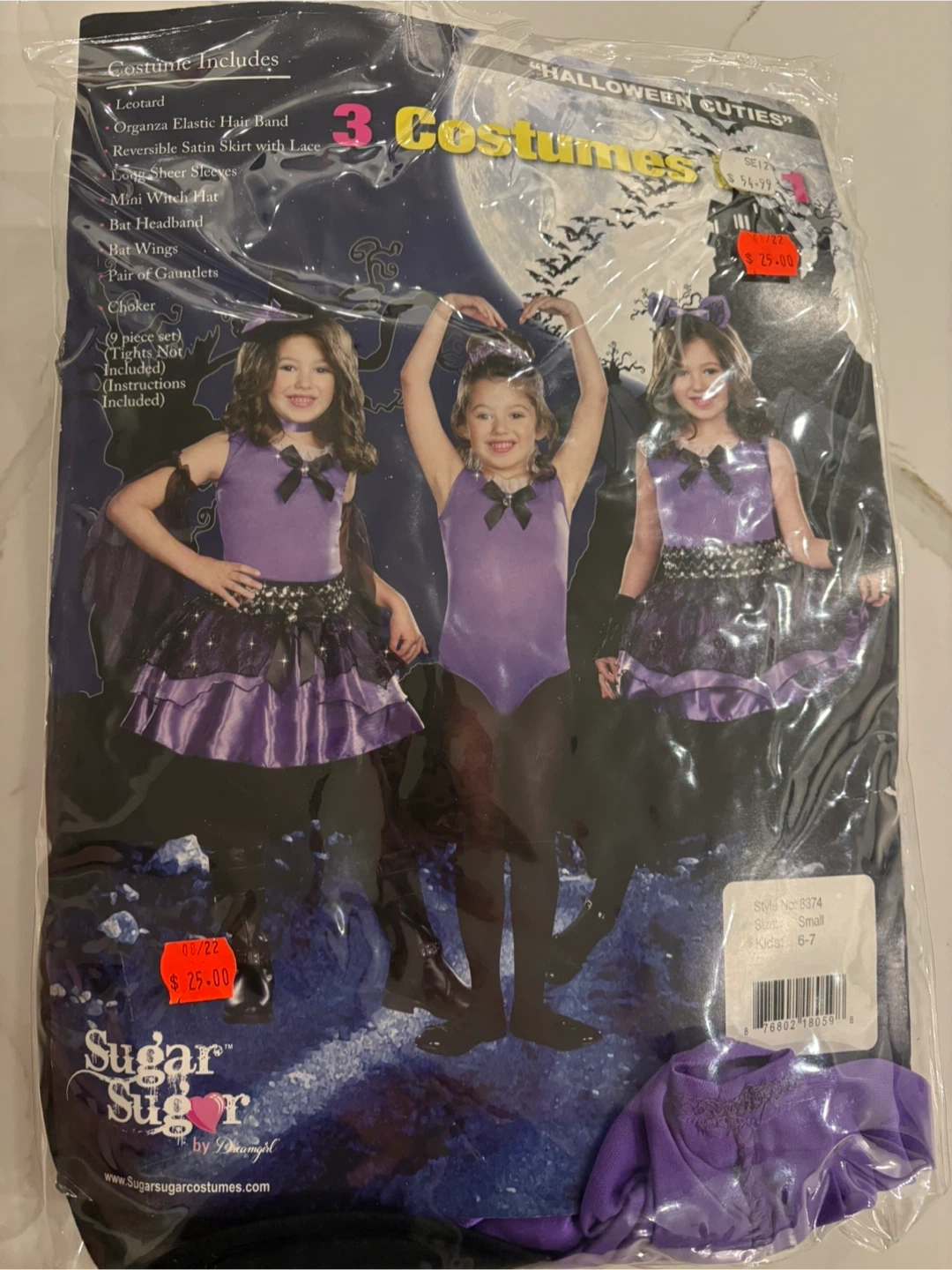 10Get ready for Halloween with this adorable Sugar Sugar "Halloween Cuties" costume! This set includes three different costume options, perfect for dress-up and spooky fun. The size is Small, suitable for kids aged 6-7.