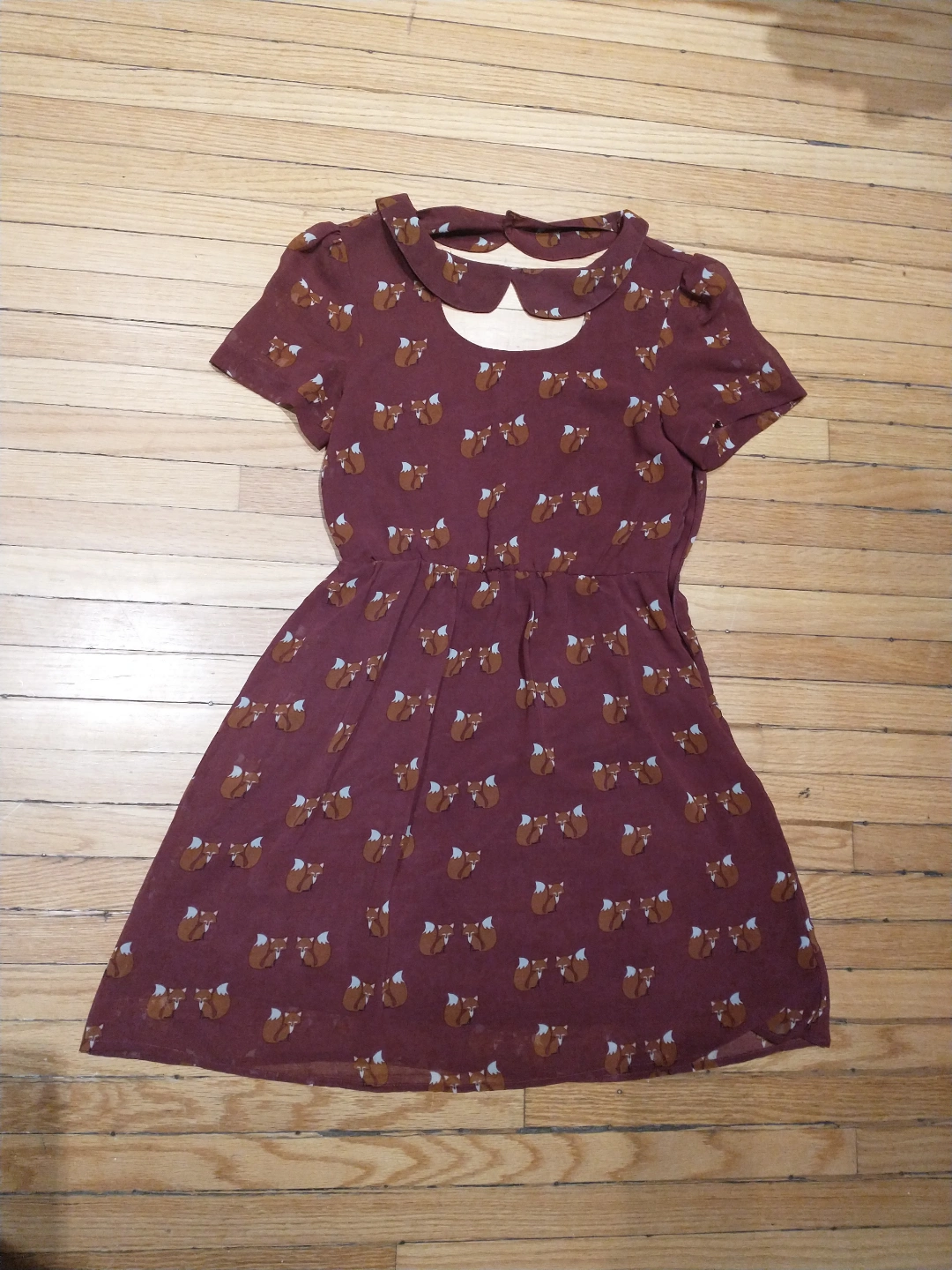 524Sugarhill Boutique dress Burgundy colour, fox pattern print Flowy material, has a lining in the skirt so it is not see through Side zipper closure Would probably best fit a size 6 or smaller Smoke free home Cash payment please