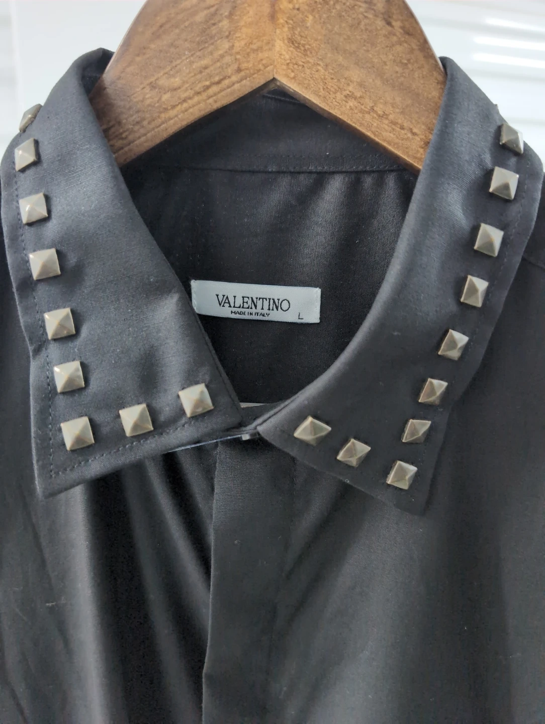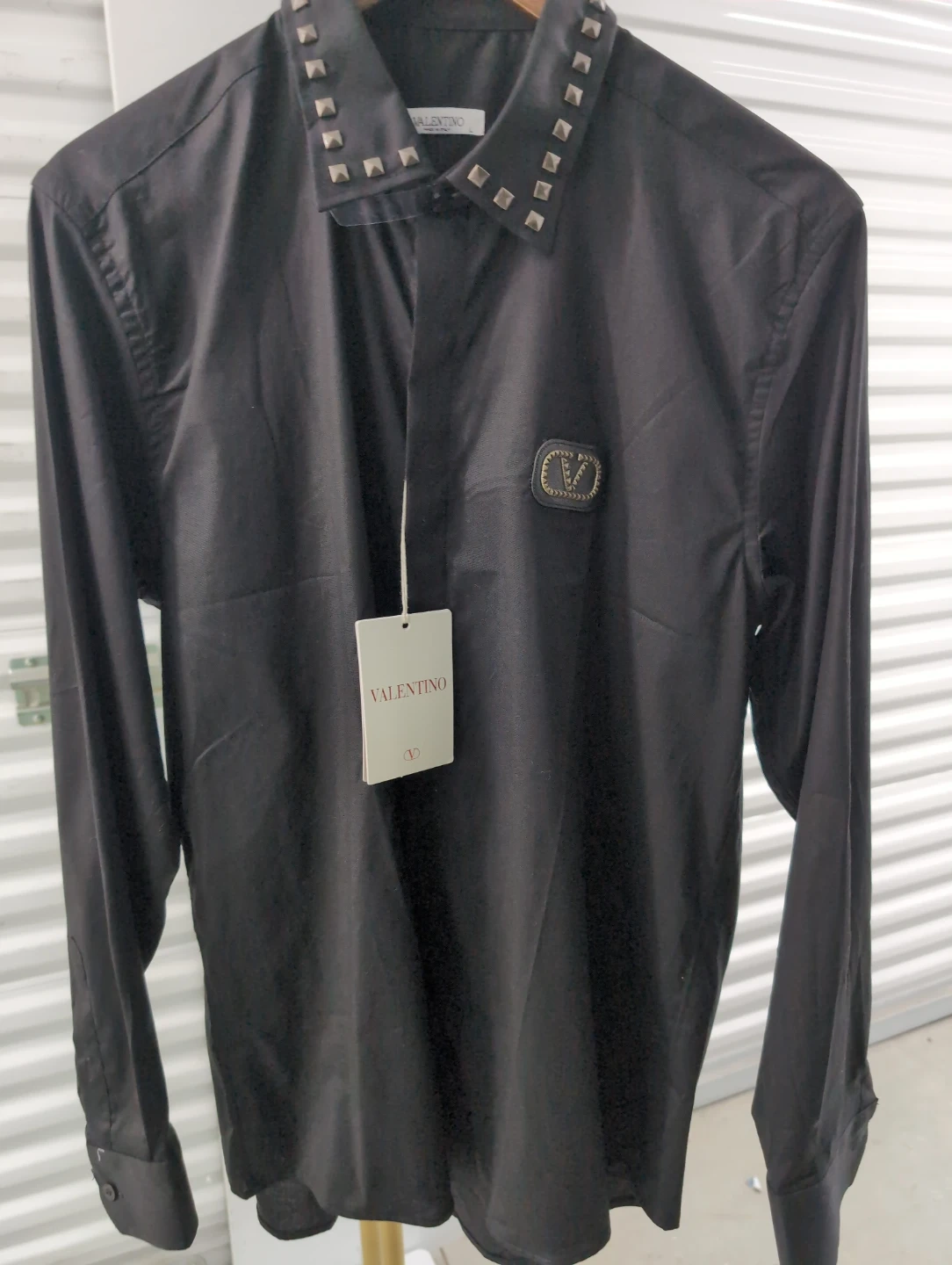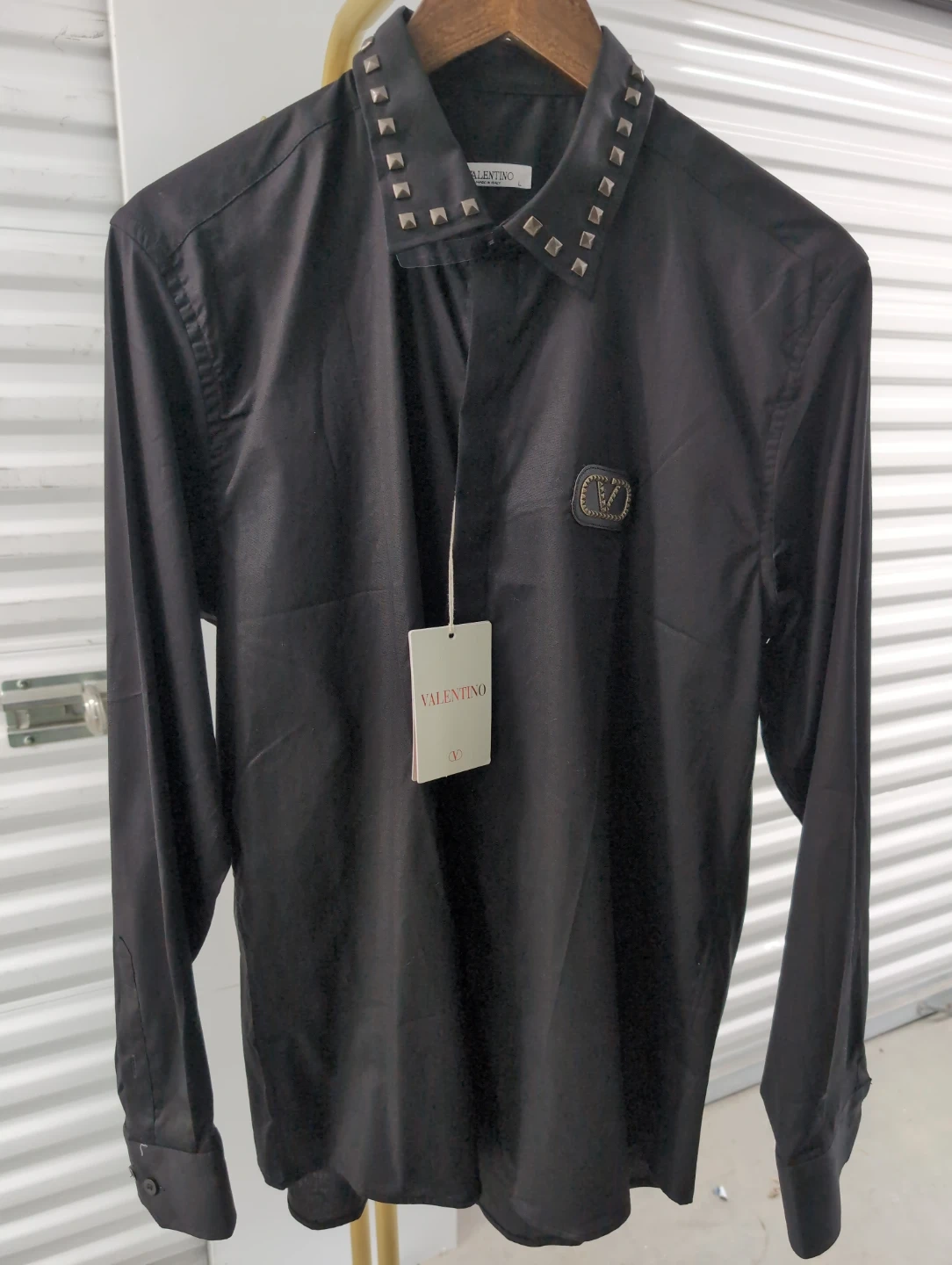Here's a stylish Valentino black shirt, size large! It features a cool studded collar and the Valentino logo on the chest. Perfect for adding a bit of edge to your wardrobe!