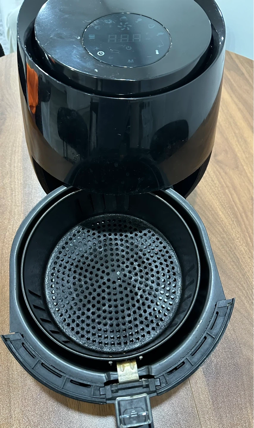 This is a black air fryer with a digital display and multiple cooking functions. It features a removable basket for easy cleaning. It's suitable for preparing a variety of meals quickly and healthily. It’s used but still very good.
