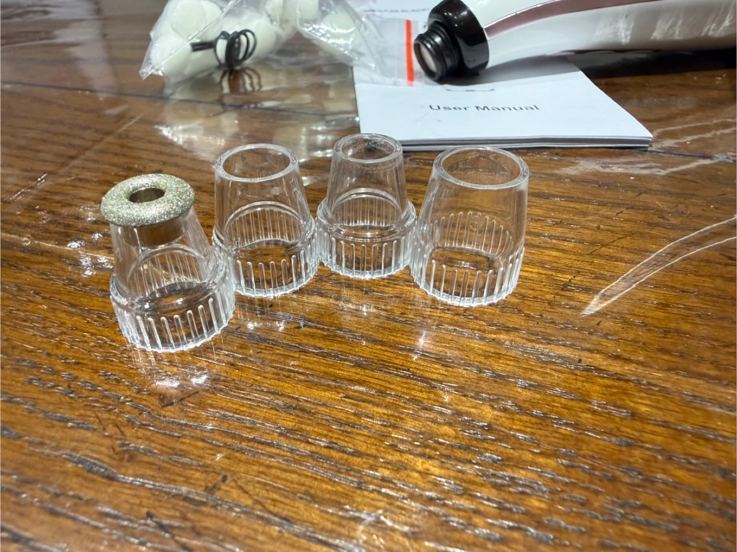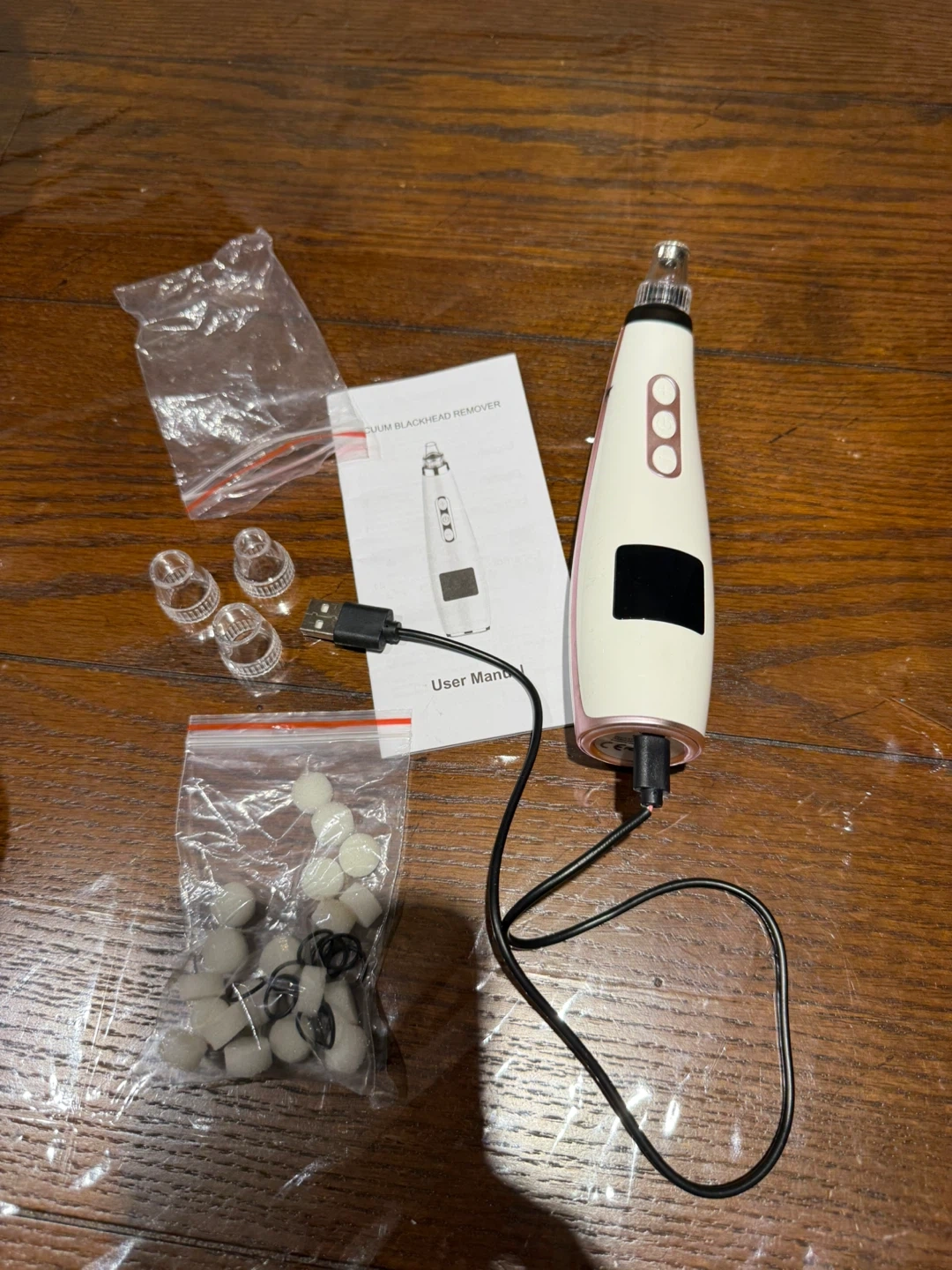 Comes with USB charging cable, user manual, multiple interchangeable suction heads, and filter sponges.