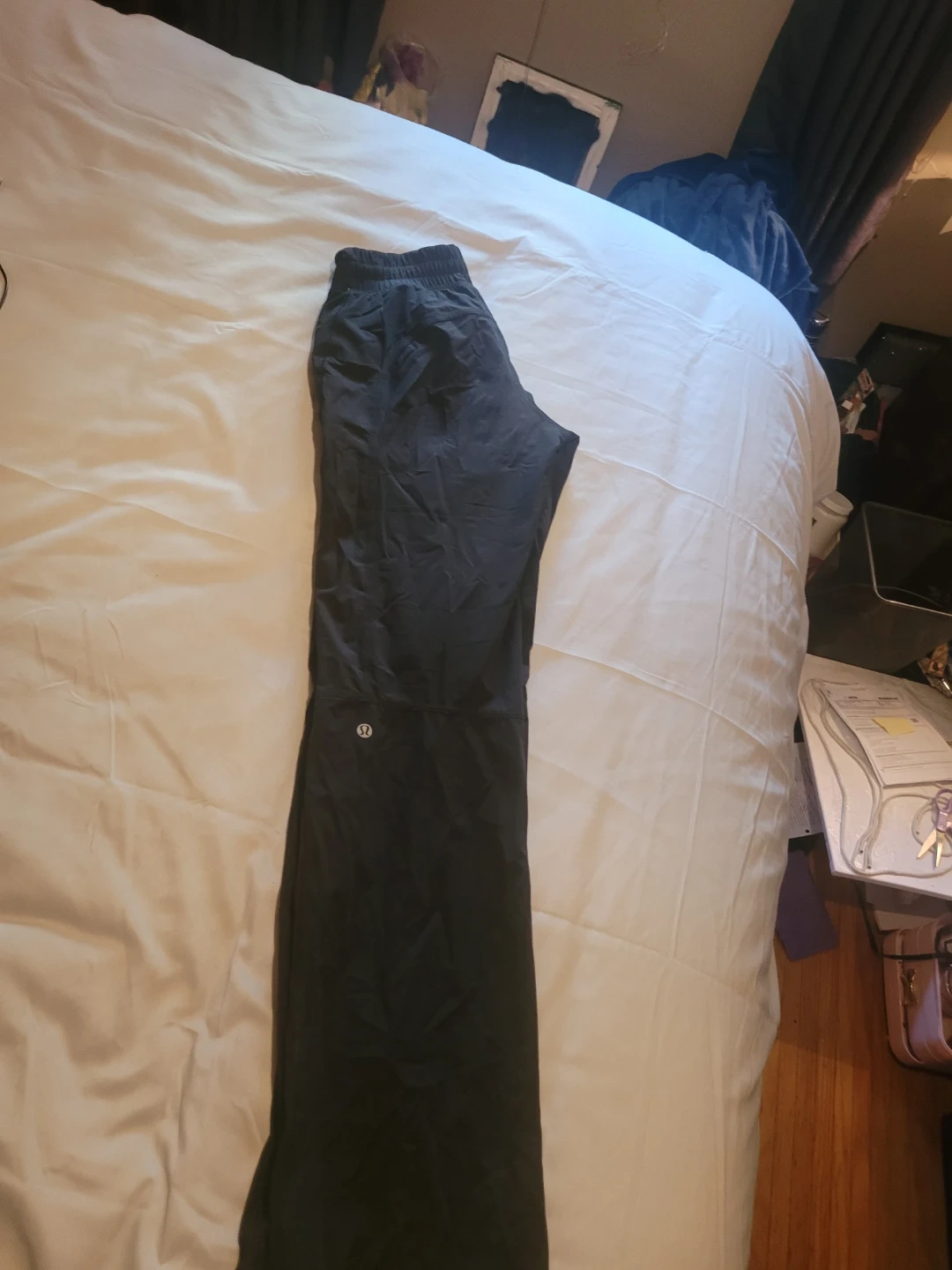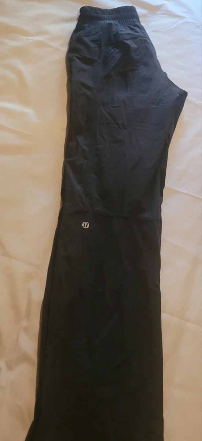 These are Lululemon running pants in black. They feature an elastic waistband. These pants are ideal for athletic activities.