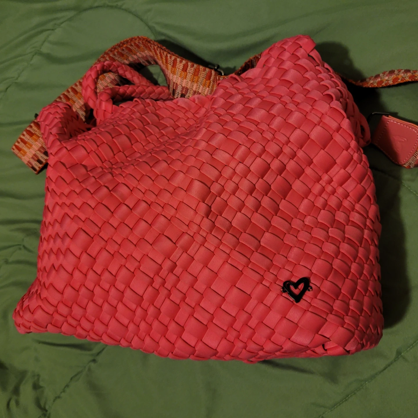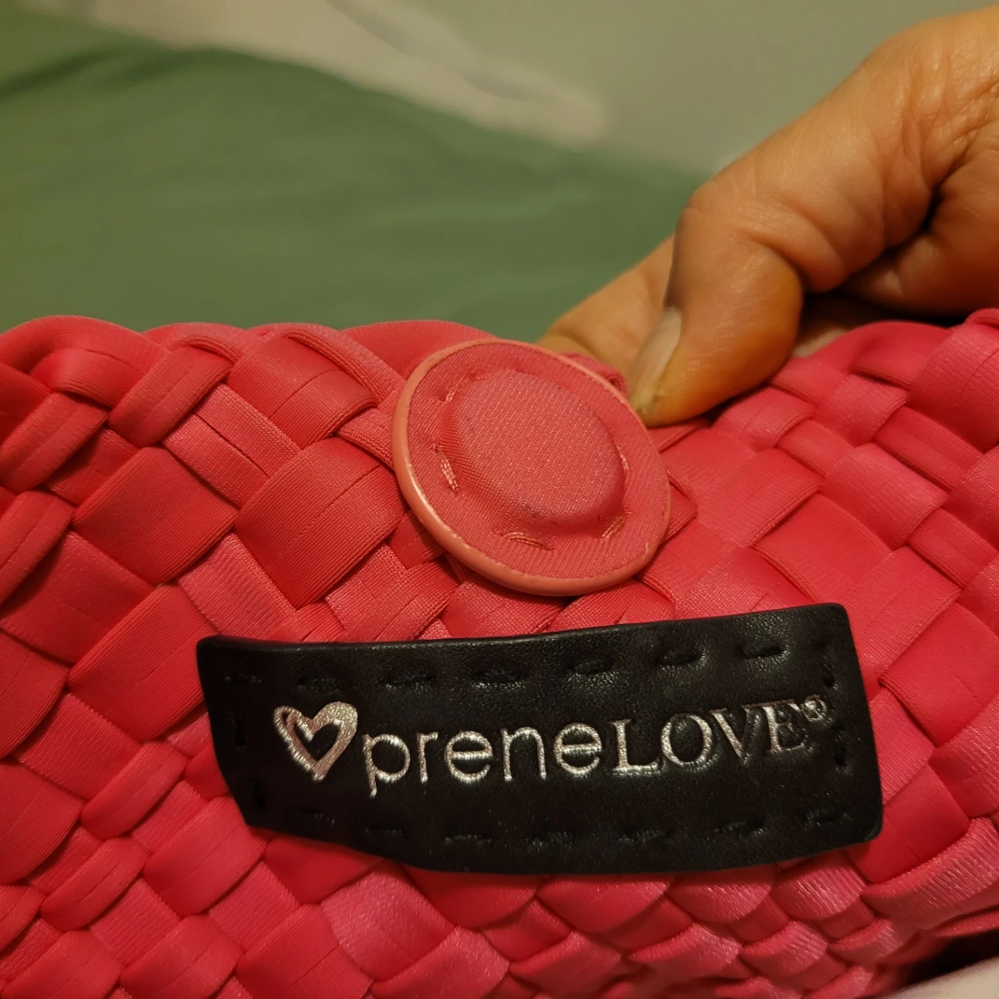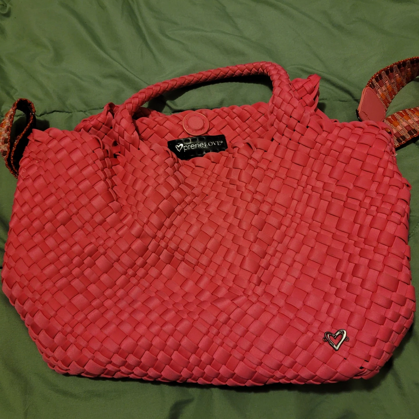 This is a PreneLove tote bag. It's woven pink and comes with a colourful strap. It has a snap closure and a small heart detail.