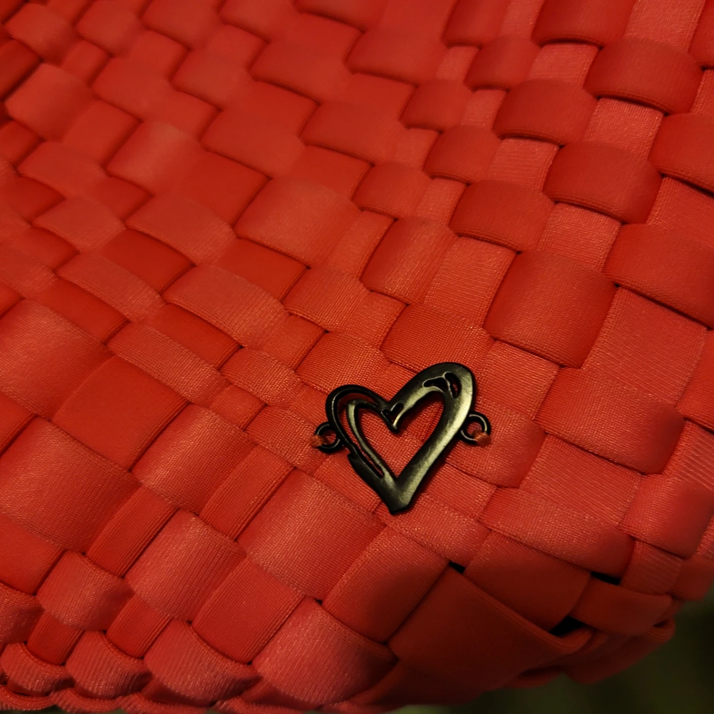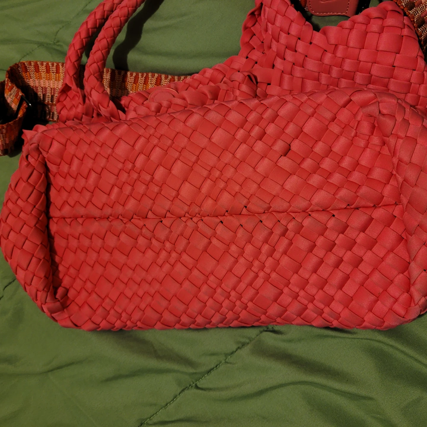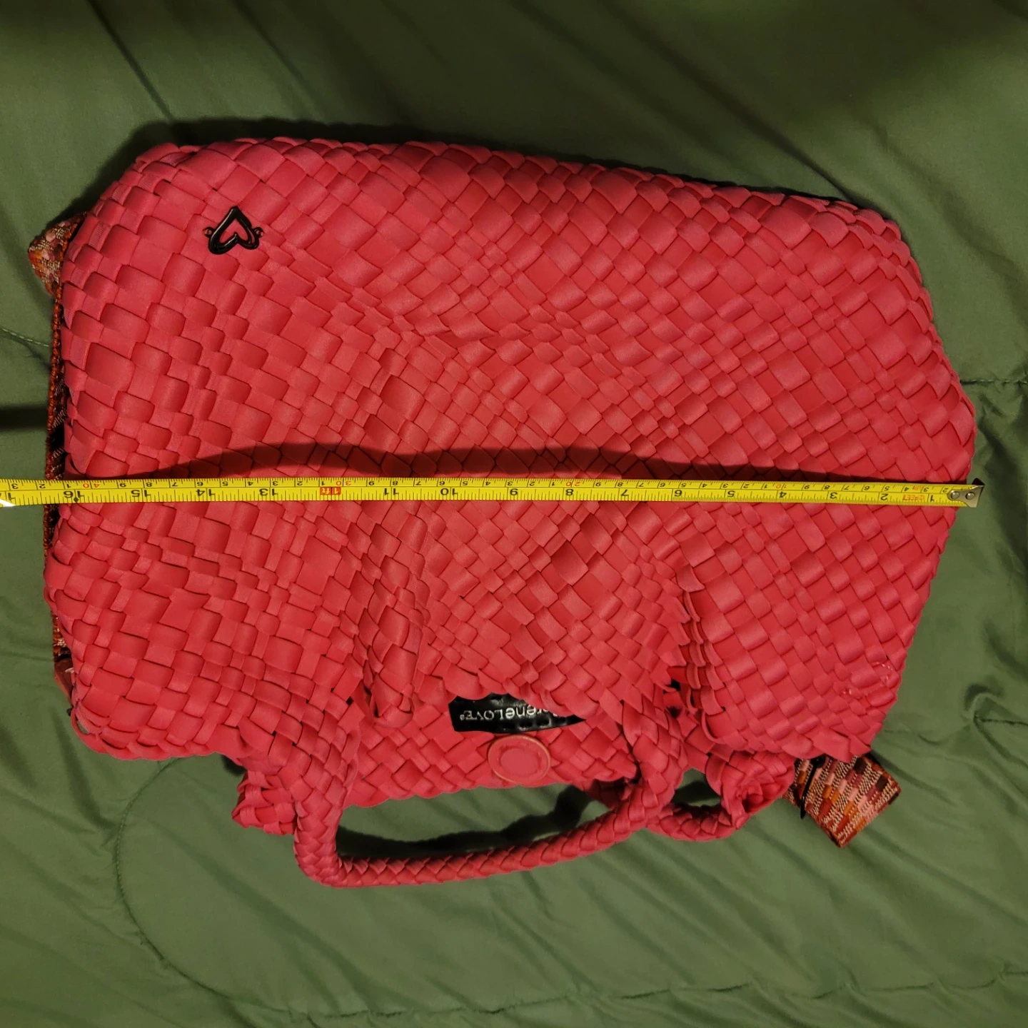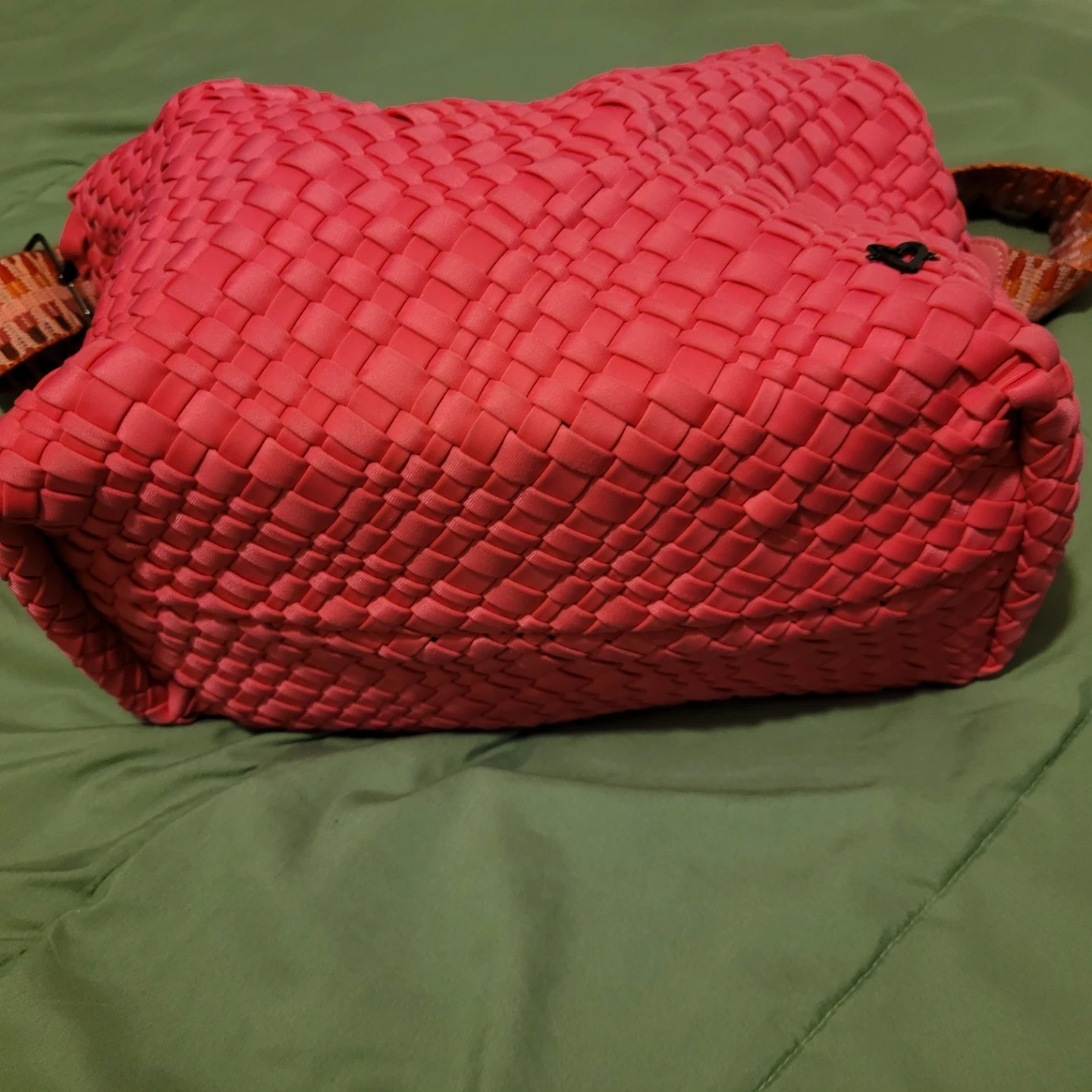 This is a PreneLove tote bag. It's woven pink and comes with a colourful strap. It has a snap closure and a small heart detail.