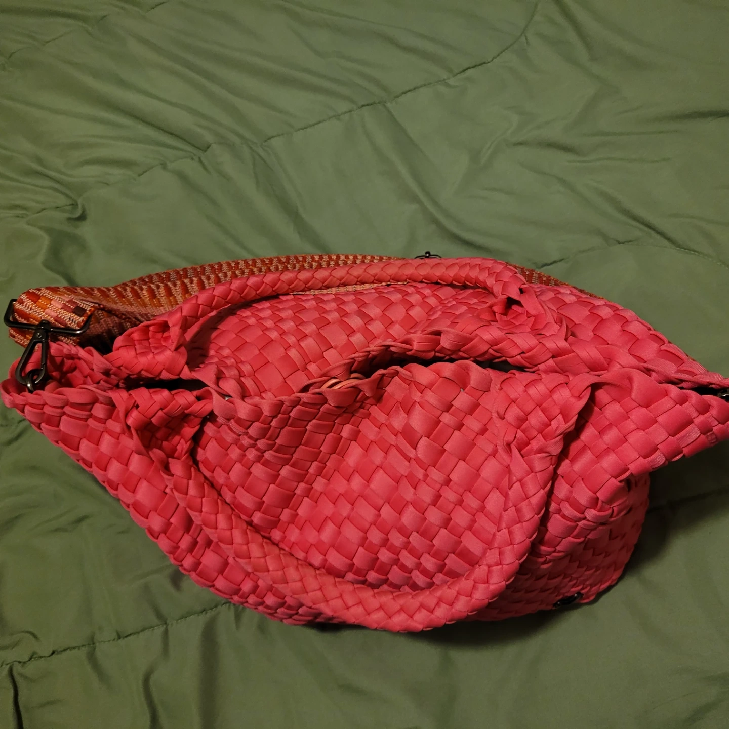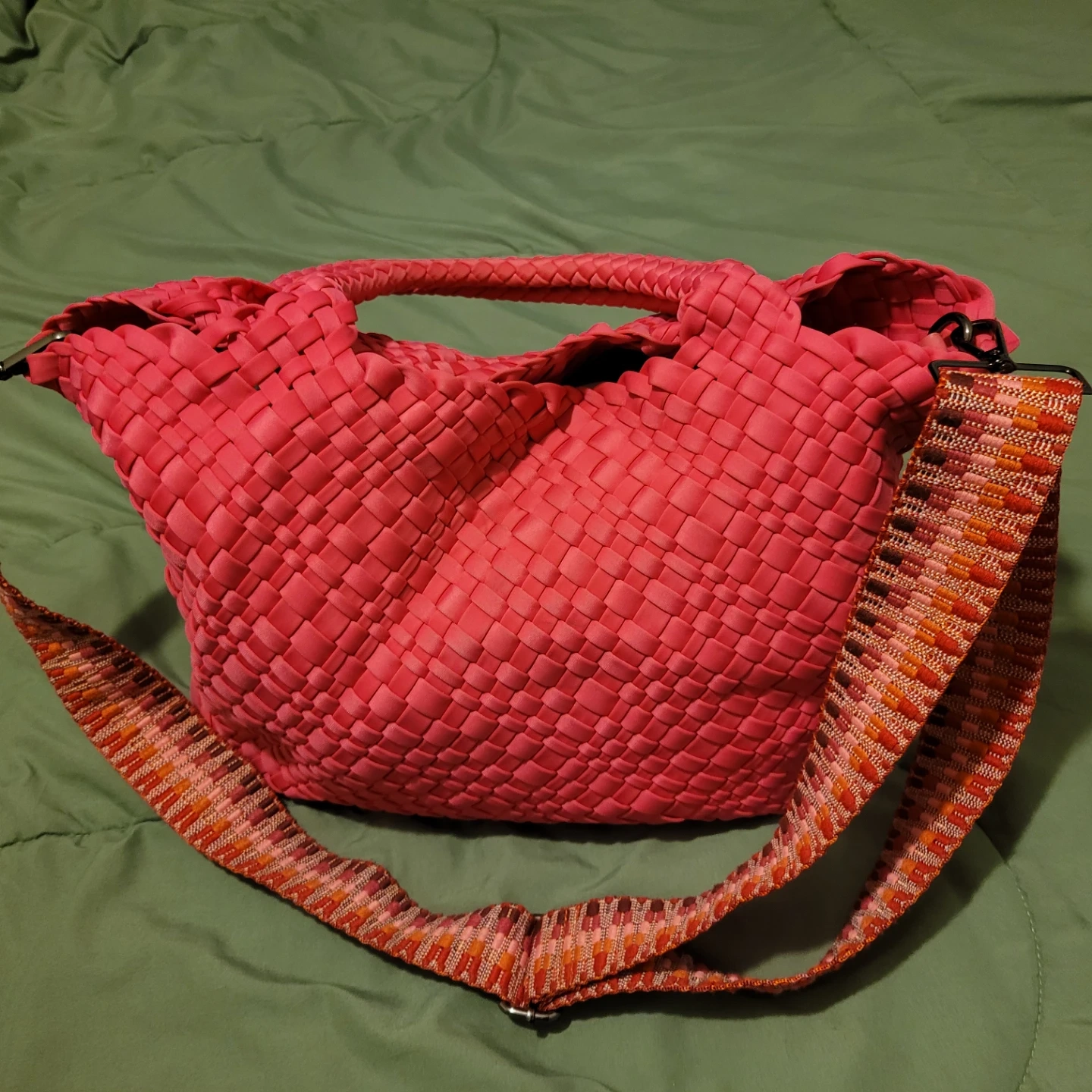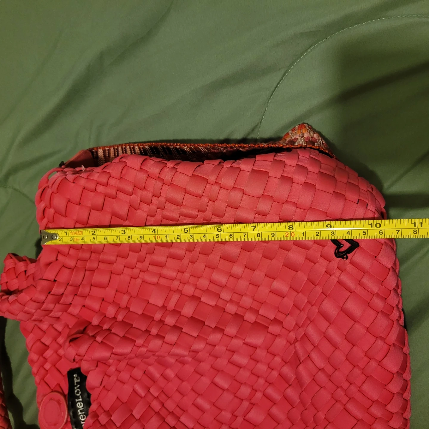 This is a PreneLove tote bag. It's woven pink and comes with a colourful strap. It has a snap closure and a small heart detail.