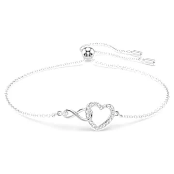 This rhodium-plated bracelet by Swarovski is an expression of eternal love. It features a twin element showing a heart and an infinity symbol intertwined. A single, bright stone adorns the infinity symbol, adding a brilliant touch to the design. This Swarovski bracelet is the perfect gift for an important woman in your life.