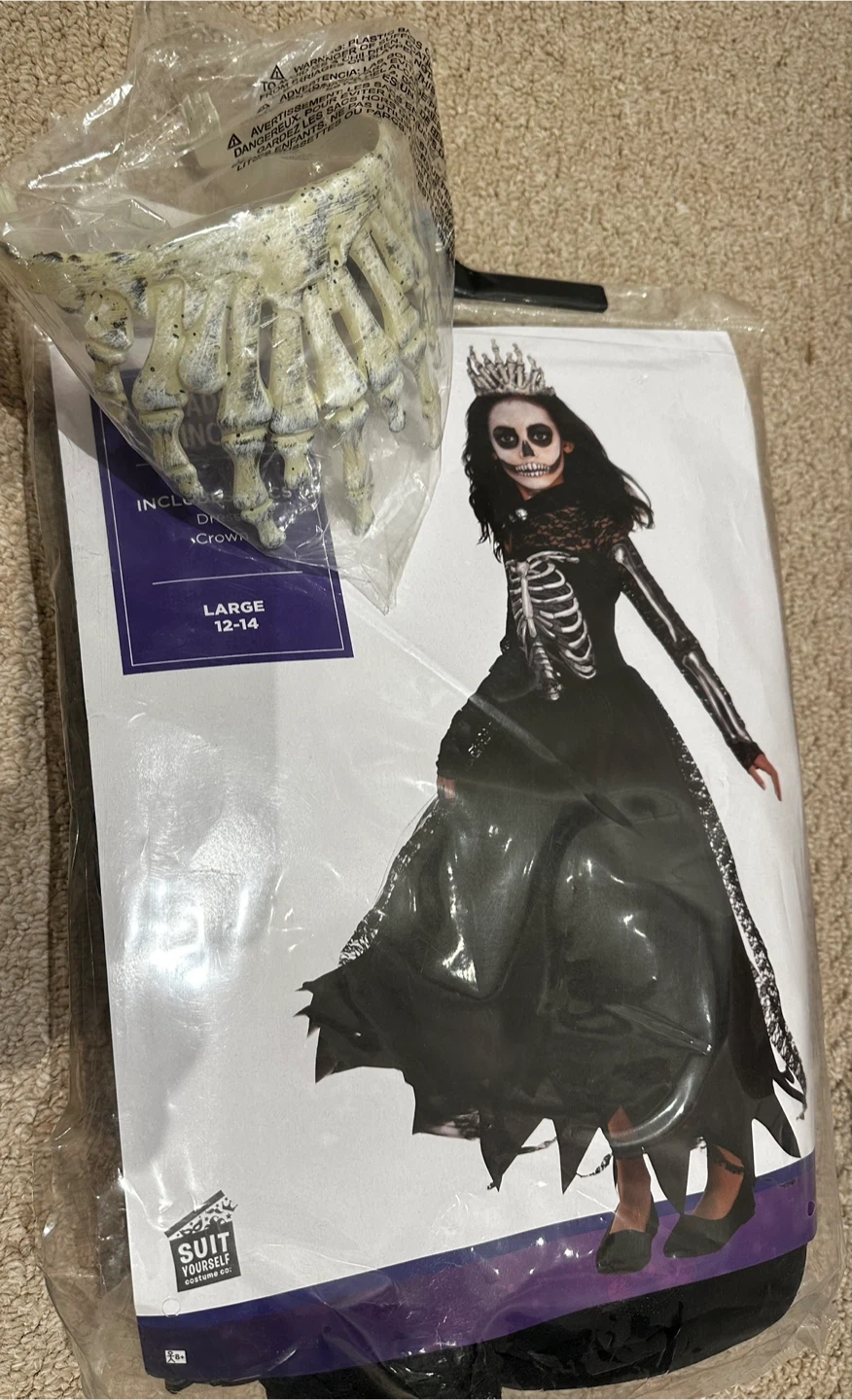 15Selling Skeleton Queen costume from Suit Yourself Costume Co! This is a size large, fitting sizes 12-14. It includes the dress and crown, perfect for Halloween or dress-up!