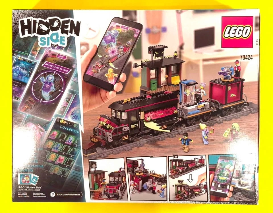 This LEGO Hidden Side train features glow-in-the-dark elements, opening compartments, and a haunted transformation function. It includes six minifigures—Jack Davids, Parker L. Jackson, J.B., Paul, Chuck the train driver, and Ms. Santos—plus two spook figures. The 698-piece model measures 14 x 15 x 61 cm when haunted.