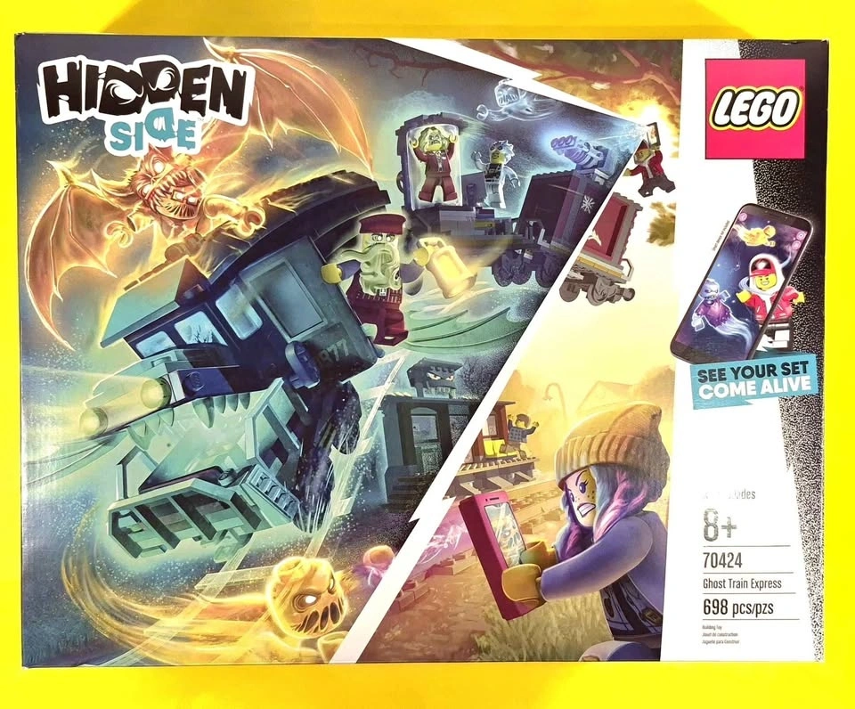 This LEGO Hidden Side train features glow-in-the-dark elements, opening compartments, and a haunted transformation function. It includes six minifigures—Jack Davids, Parker L. Jackson, J.B., Paul, Chuck the train driver, and Ms. Santos—plus two spook figures. The 698-piece model measures 14 x 15 x 61 cm when haunted.