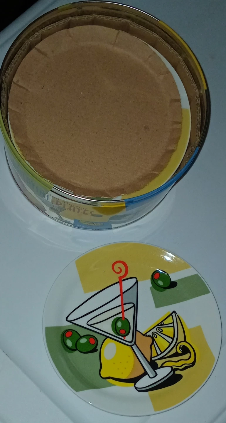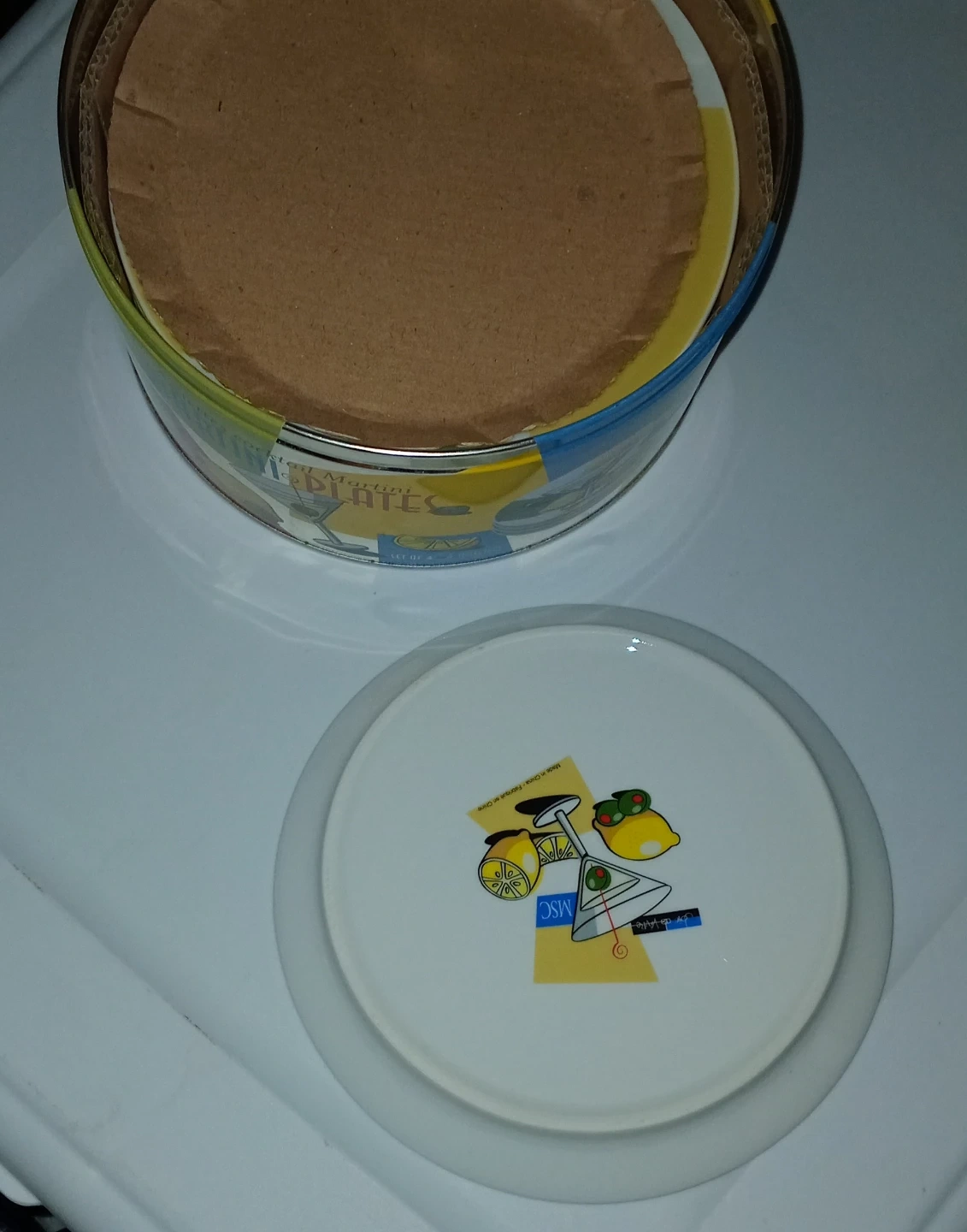 Set of 4 martini cocktail plates. Features a fun martini glass design with lemons and olives. Stored in a decorative tin.