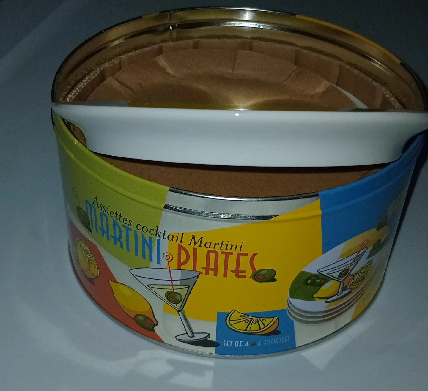 Set of 4 martini cocktail plates. Features a fun martini glass design with lemons and olives. Stored in a decorative tin.