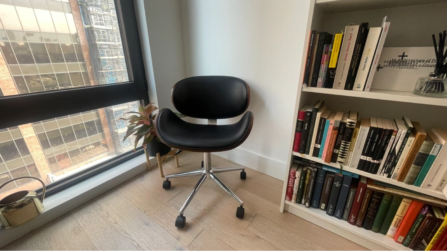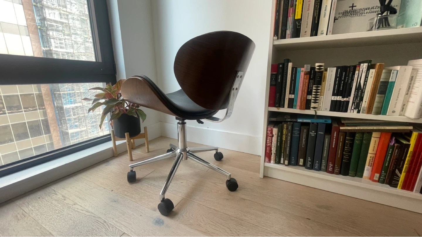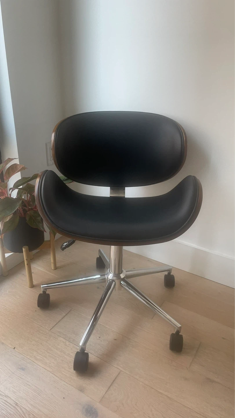 This office chair has a curved walnut wood shell with a comfortable black leatherette seat. It's equipped with a chrome five-star base and casters for easy mobility. It's adjustable in height for your convenience. This chair is great for a home office setup!