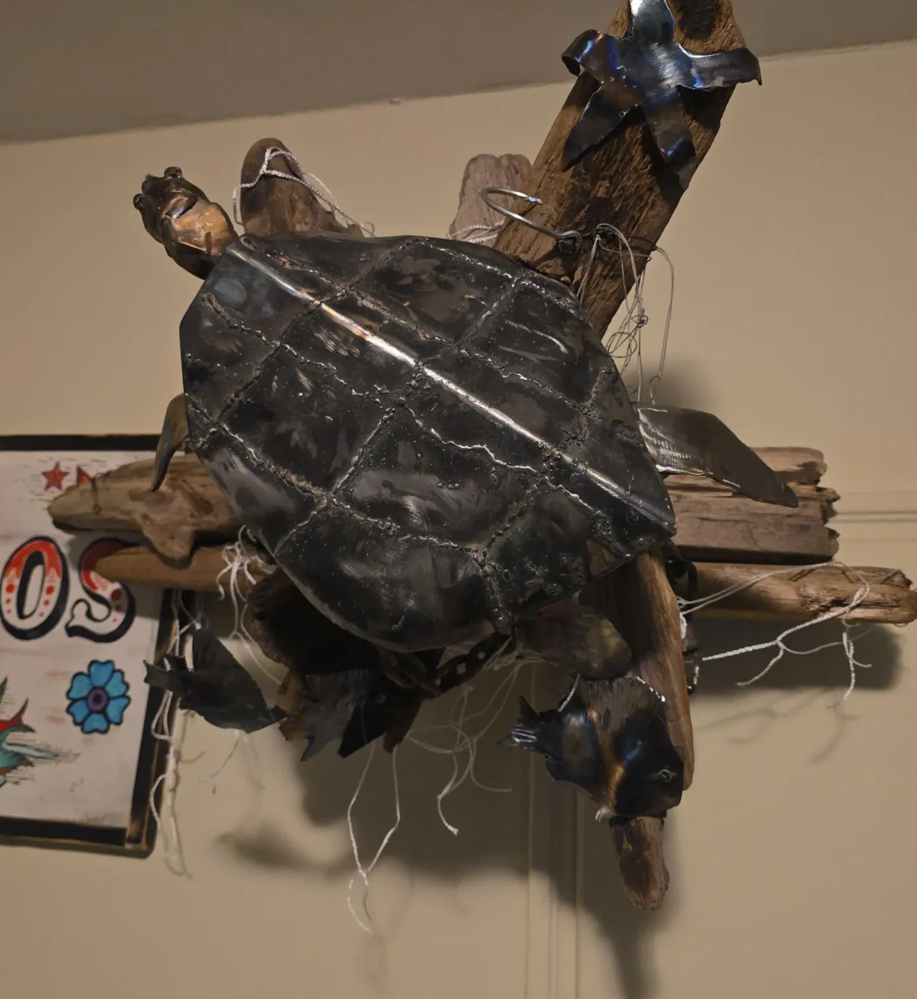 A unique handcrafted sculpture featuring a metal turtle and small fish, mounted on natural driftwood. This piece adds a rustic and nautical touch to any space. It's a conversation starter!