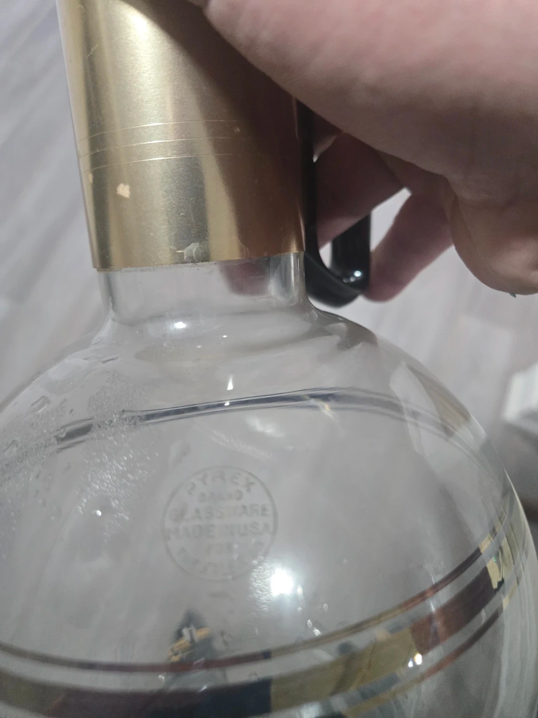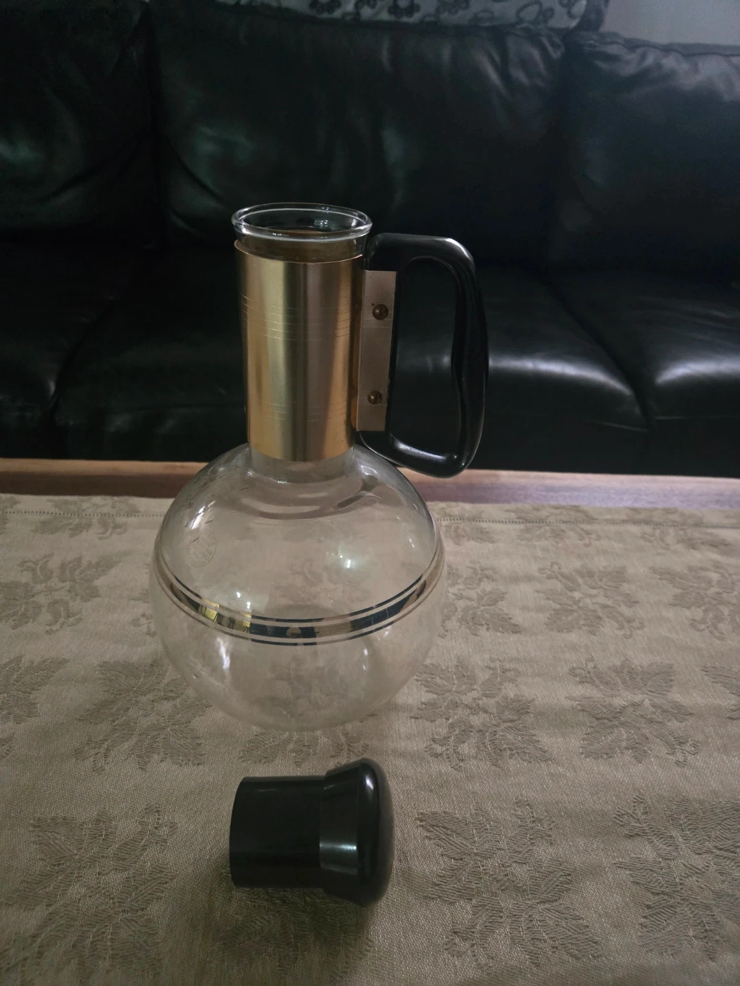 This vintage Pyrex carafe is made of clear glass with a gold trim design. It features a black plastic handle and includes a matching black stopper lid. Perfect for serving beverages at a retro-themed gathering! Made in U.S.A