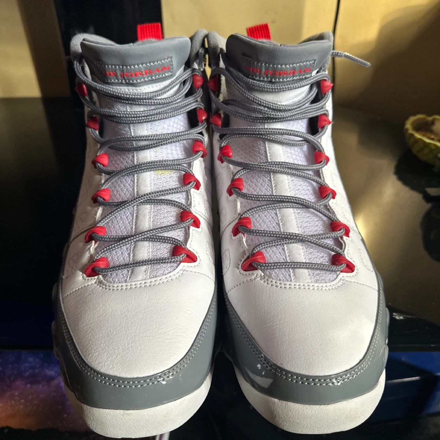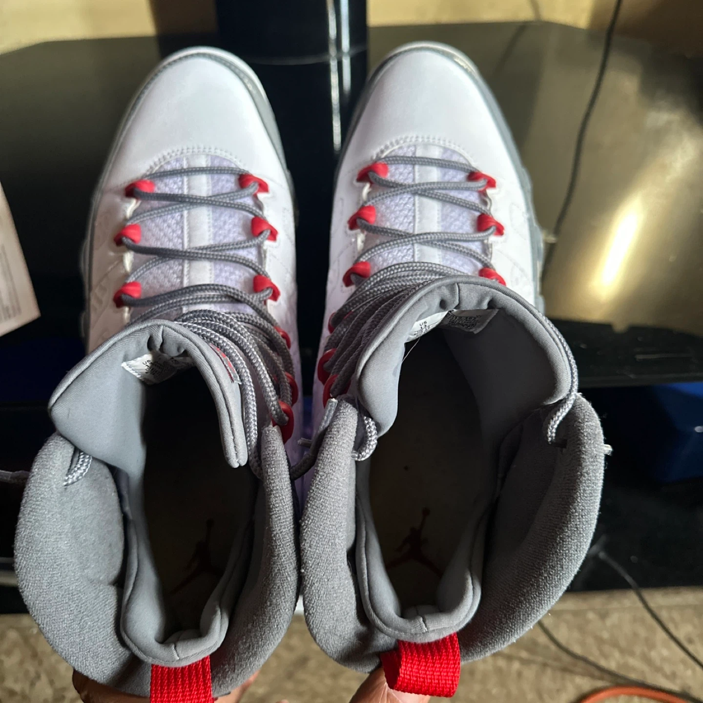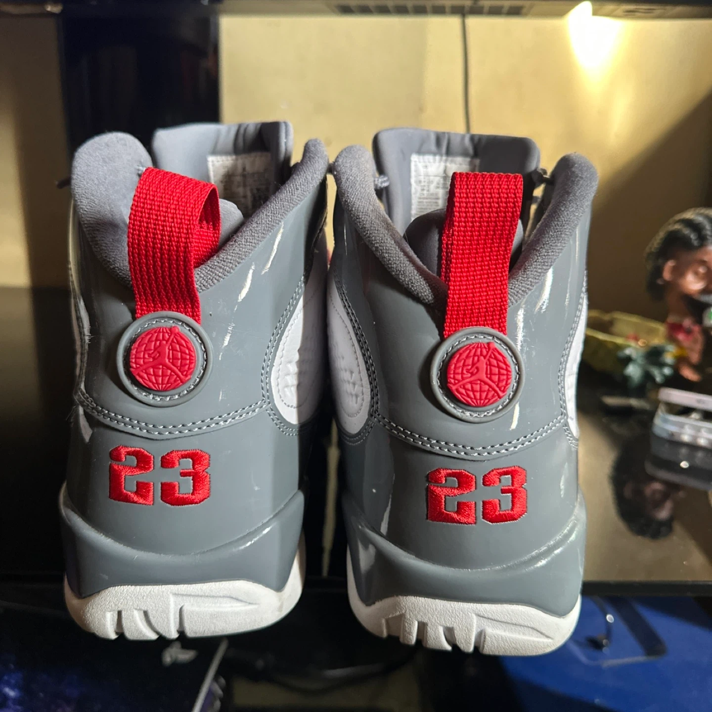 Selling a pair of Air Jordan 9 Retro sneakers! These are in a white and grey colorway, with red accents. They feature the number 23 on the back. Perfect for any sneakerhead!