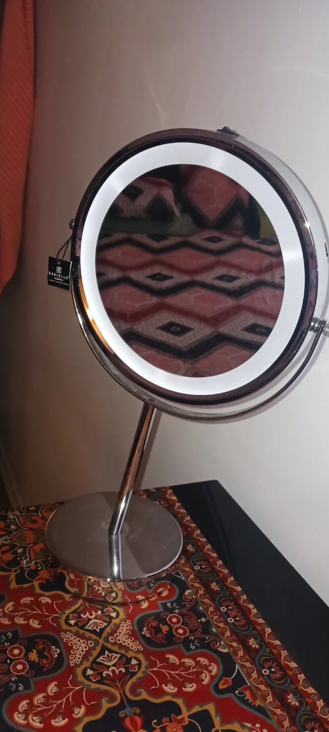 This is a Danielle Creations lighted makeup mirror. It features a bright LED ring light. This mirror is perfect for applying makeup and grooming tasks.