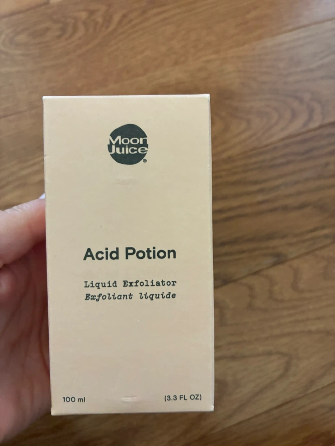 This is Moon Juice Acid Potion, a liquid exfoliator. It's 100 ml (3.3 FL OZ). Glycolic, Lactic, and Salicylic Acid help unclog pores and resurface skin. Niacinamide and adaptogenic Reishi help hydrate, soothe, and balance.