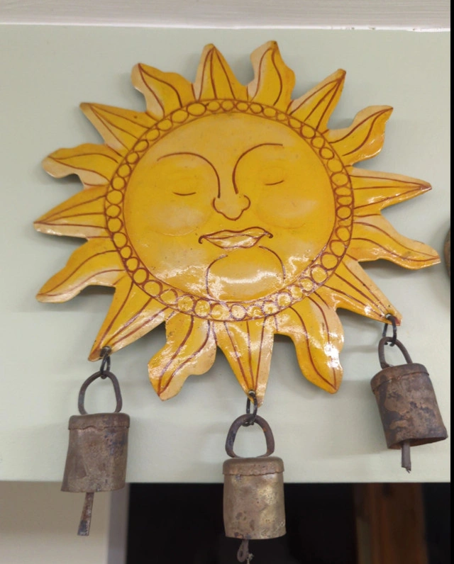 1000+This enchanting Sun Face Wall Hanging with Bells whispers tales of romance and adventure, brought back from the vibrant streets of Brazil in 1998. Details: - Handcrafted with love and care - Unique sun face design with melodious bells - A symbol of joy, love, and warmth Condition: - Gently loved, with character