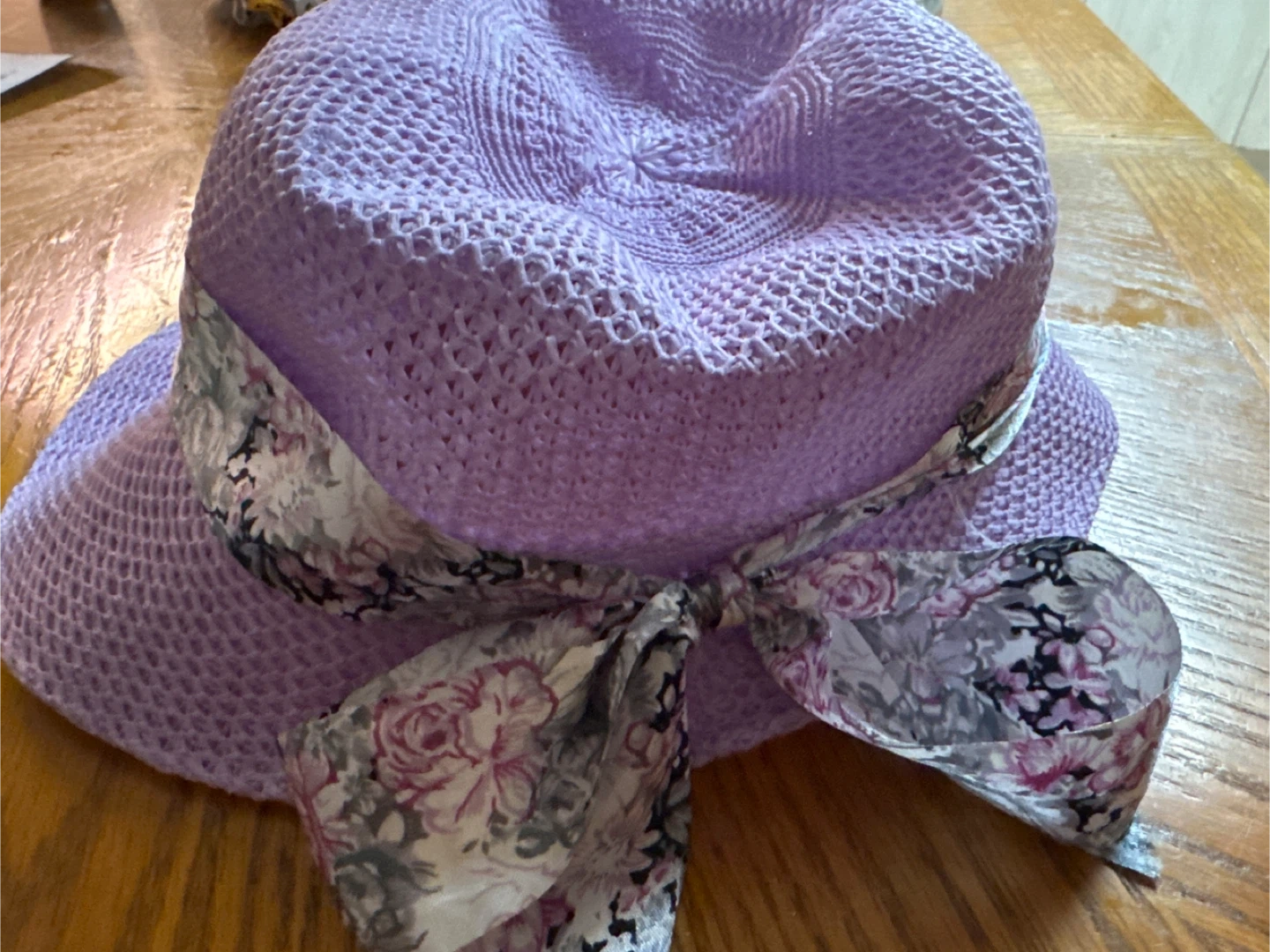 A lovely lilac woven sun hat, perfect for sunny days! It features a stylish floral ribbon detail. The hat is in great condition and ready for a new home