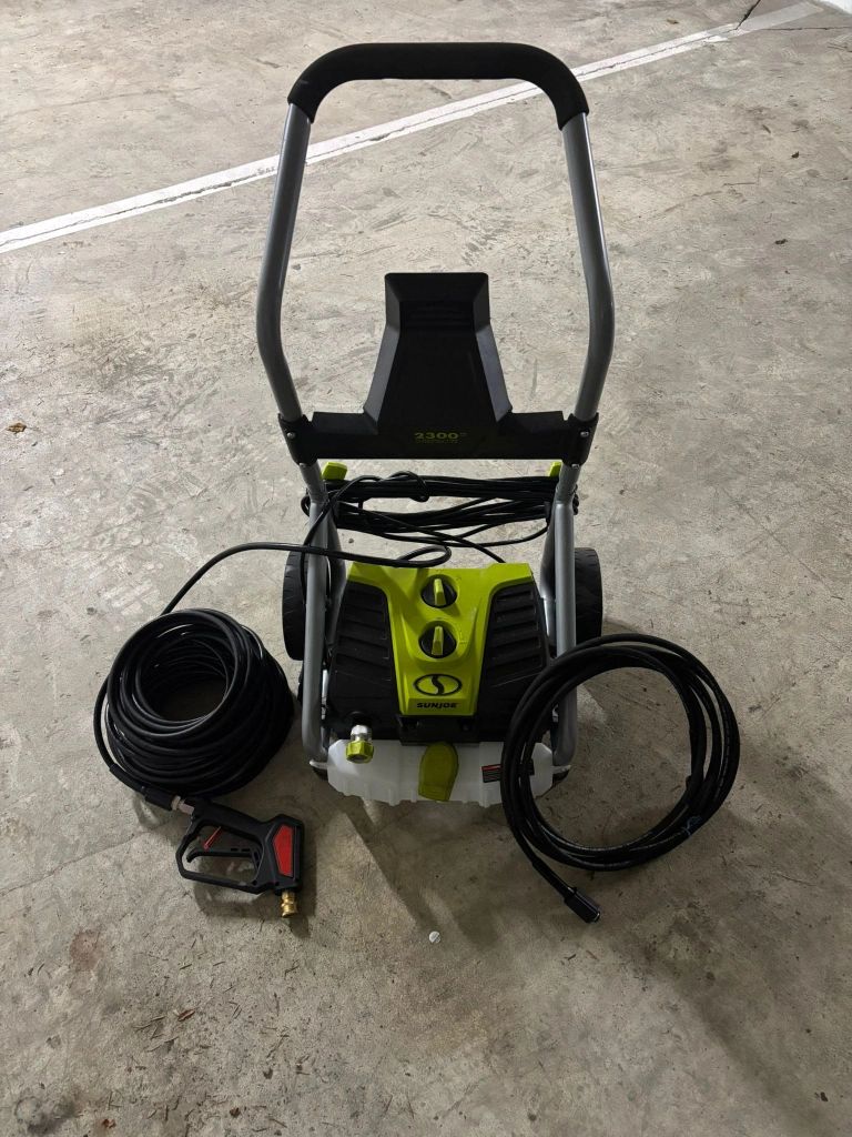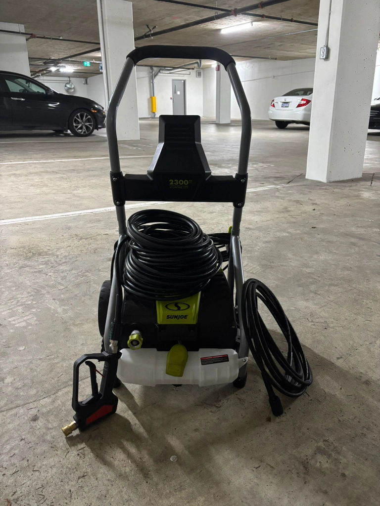 Electric pressure washer, 2300 PSI. Includes spray gun, hoses, and various nozzles. Great for cleaning patios, decks, vehicles, and more. Portable design with wheels for easy manoeuvrability.