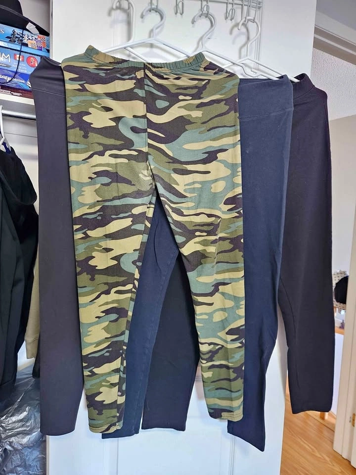 Bundle includes 4 pairs of women's leggings in size M/L. Features camo and black pairs. They are stretchy, comfortable, and in good condition with no rips or stains. Selling as a bundle only.