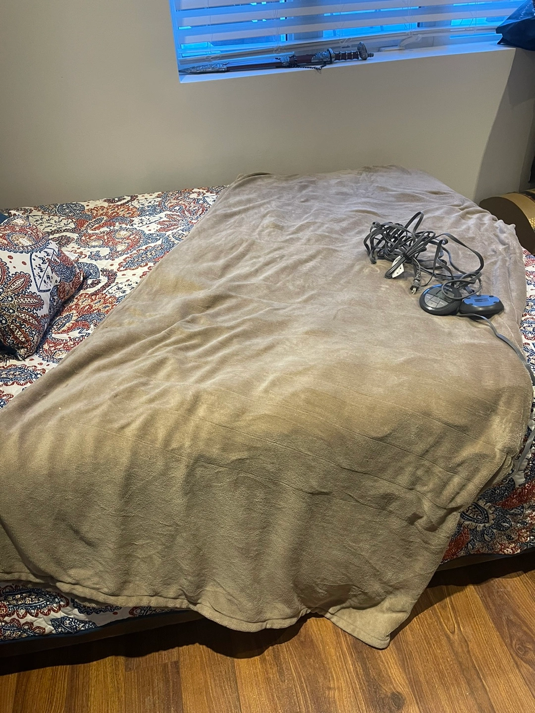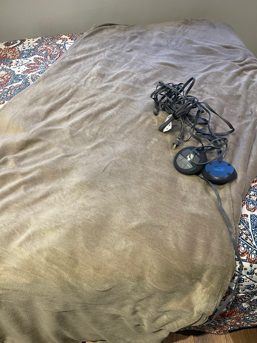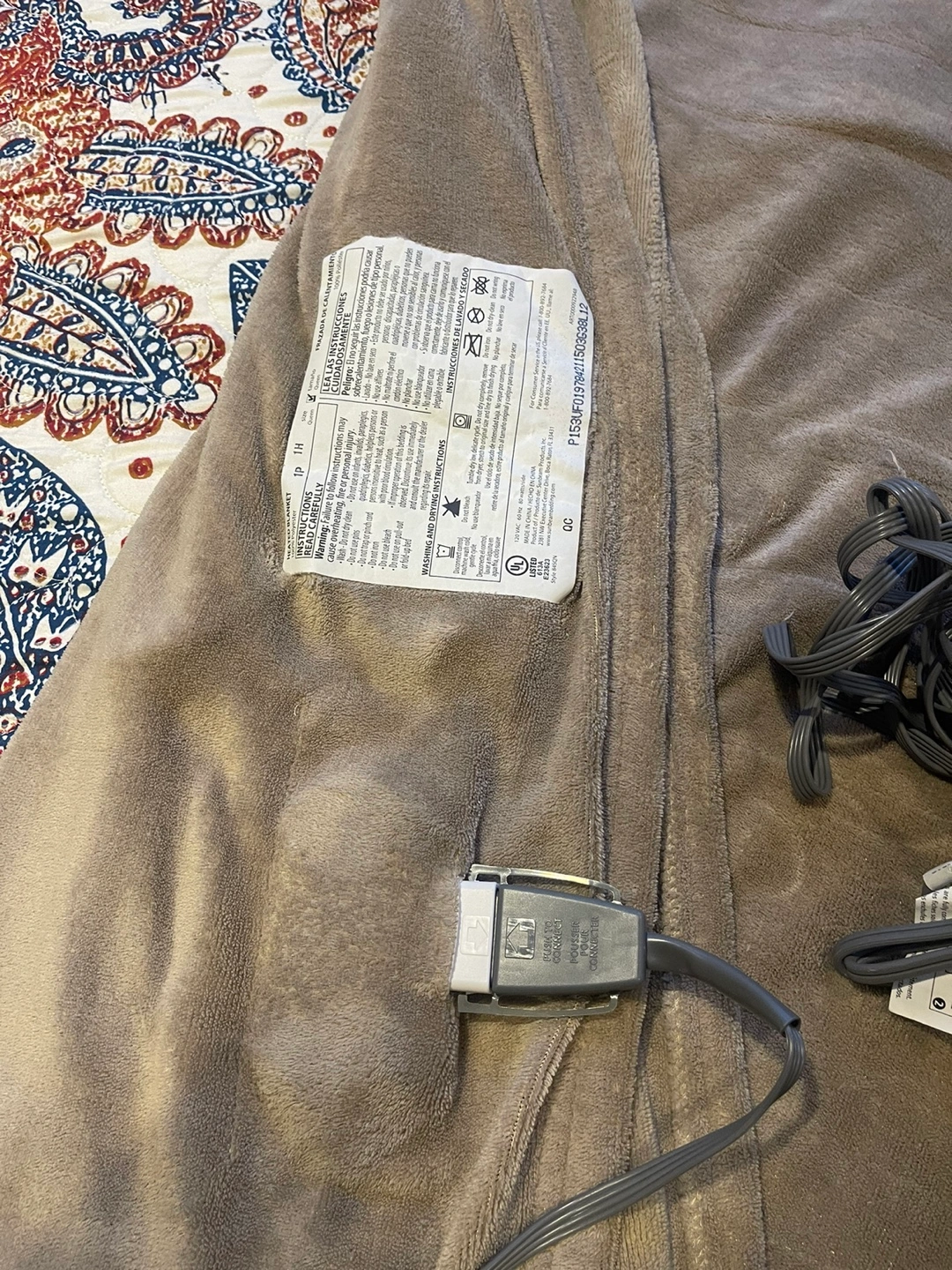 Grey heated throw blanket. Features two controllers. Includes power cord. Machine washable.