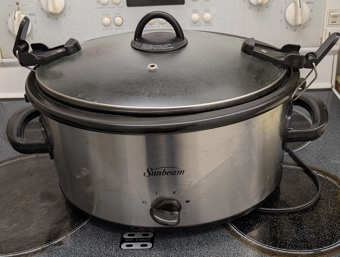 Selling a Sunbeam slow cooker. It comes with a lid that has clips to secure it, making it easier to carry. Perfect for making soups and stews!