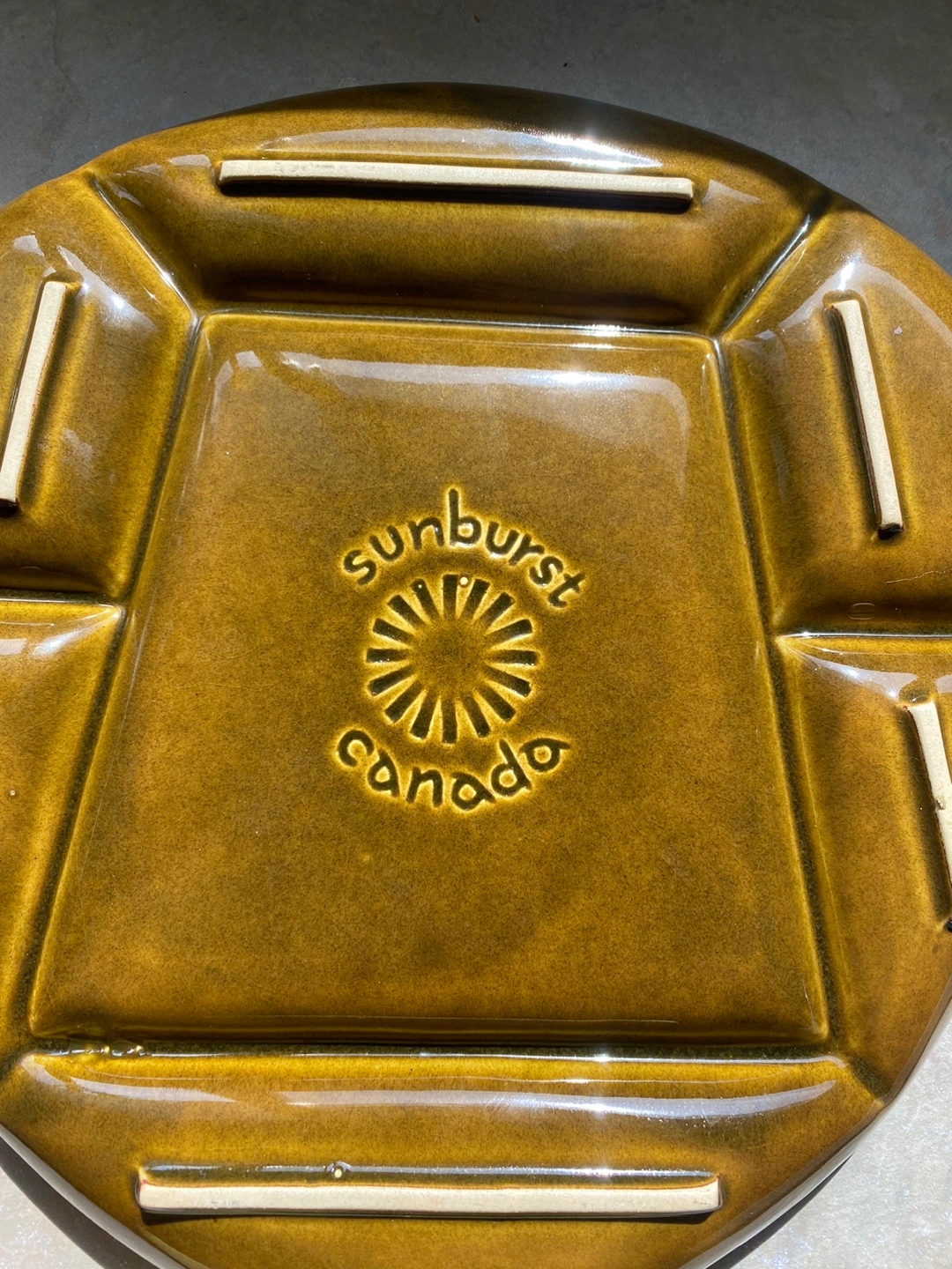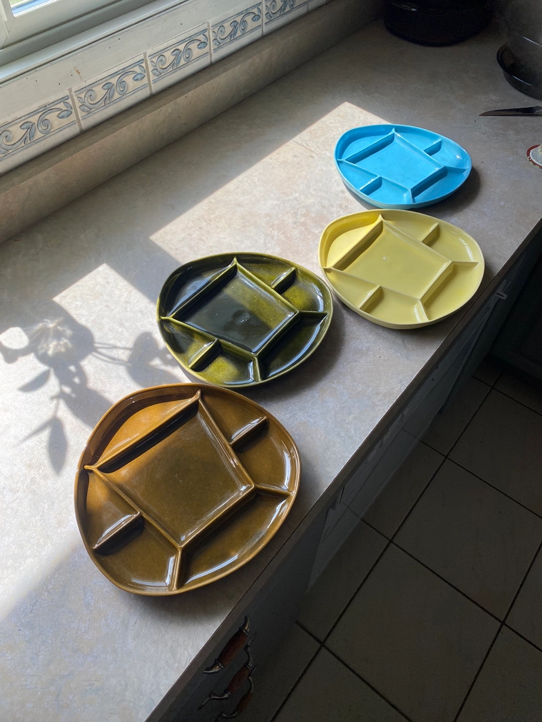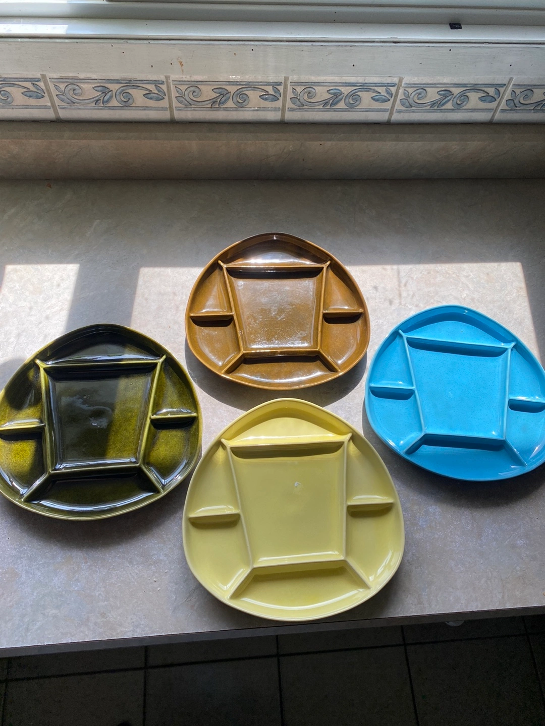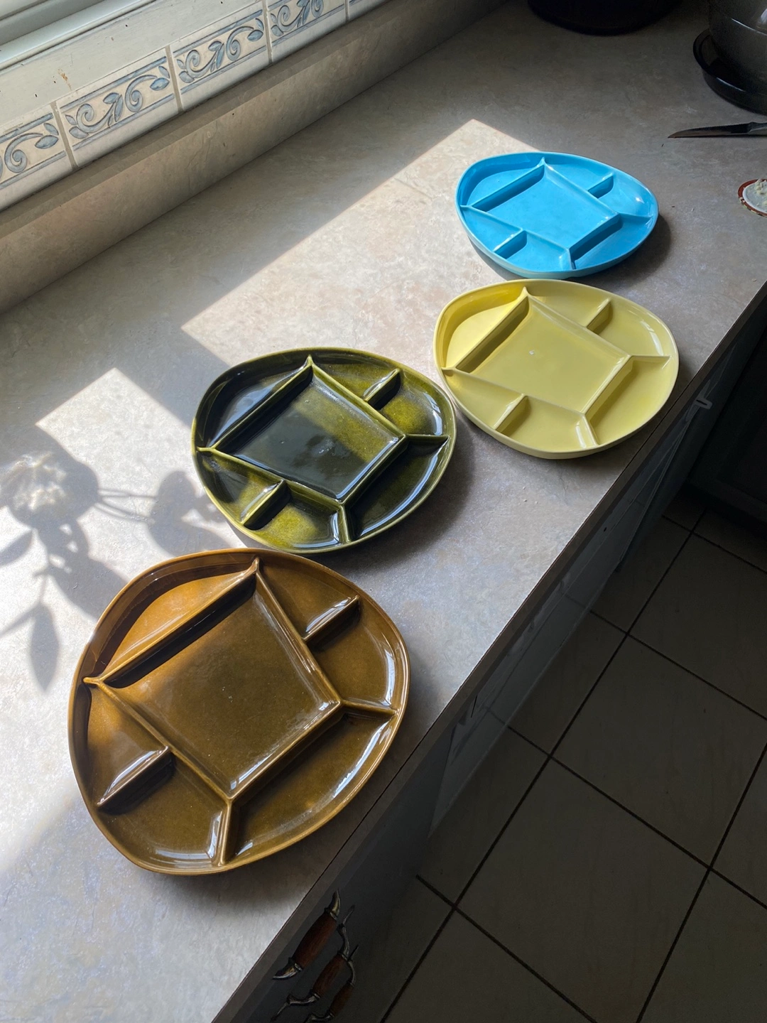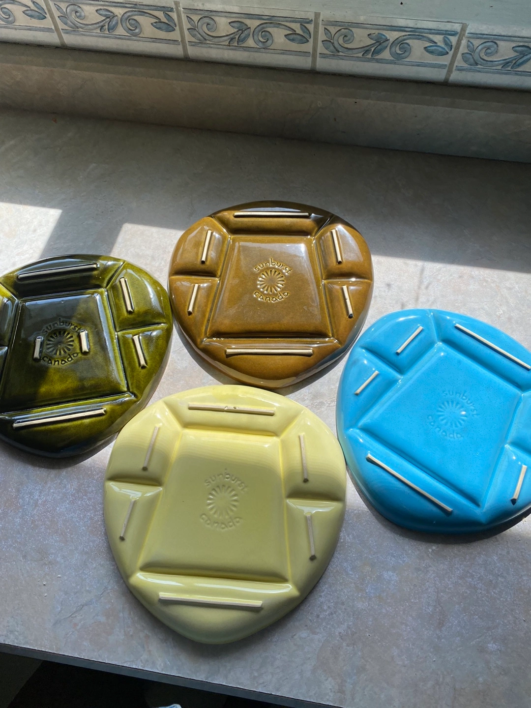 Selling a set of four vintage melamine snack plates from Sunburst Canada. These unique plates come in a variety of colours: blue, yellow, green, and brown. They're in great shape and ready for a new home!