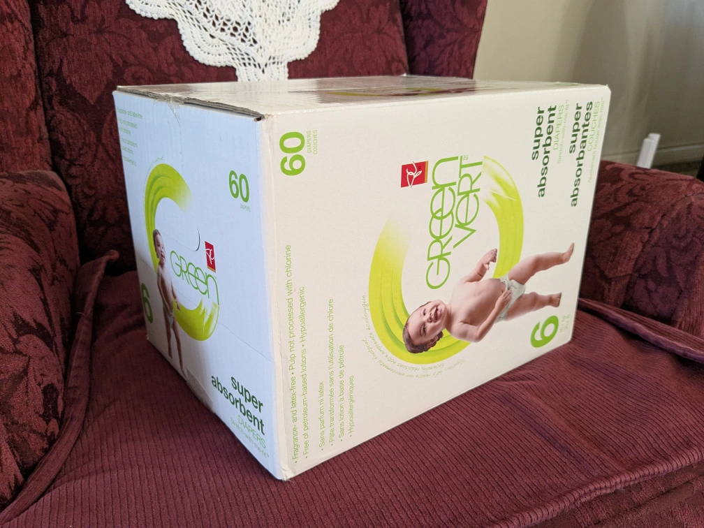 Selling a box of PC Green Vert super absorbent diapers in size 6 and an additional pouch (unopened) total of 90 size 6 diapers.