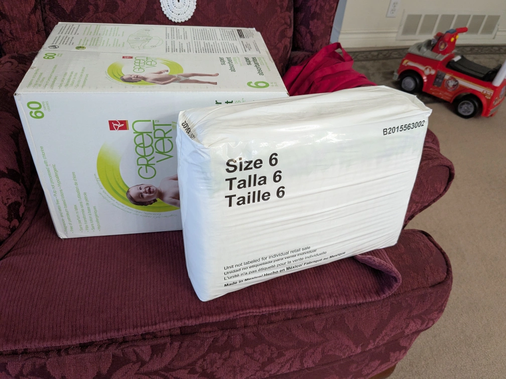 Selling a box of PC Green Vert super absorbent diapers in size 6 and an additional pouch (unopened) total of 90 size 6 diapers.