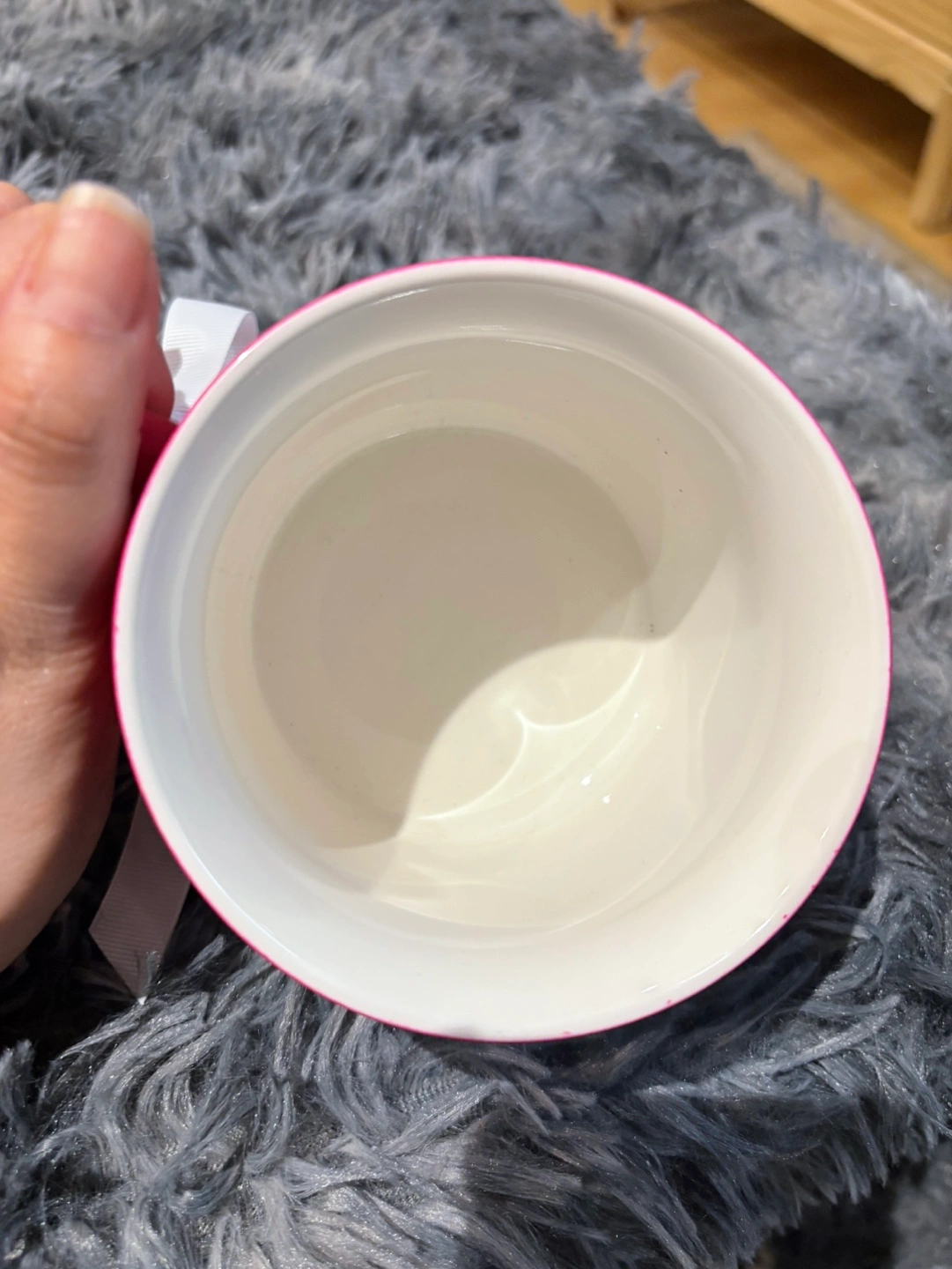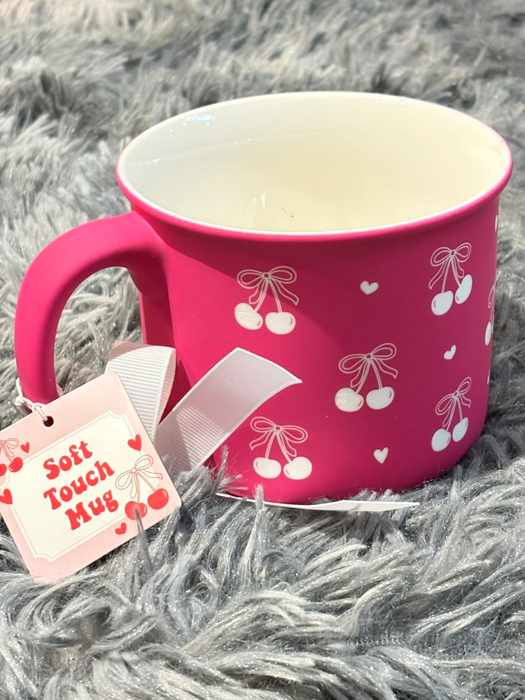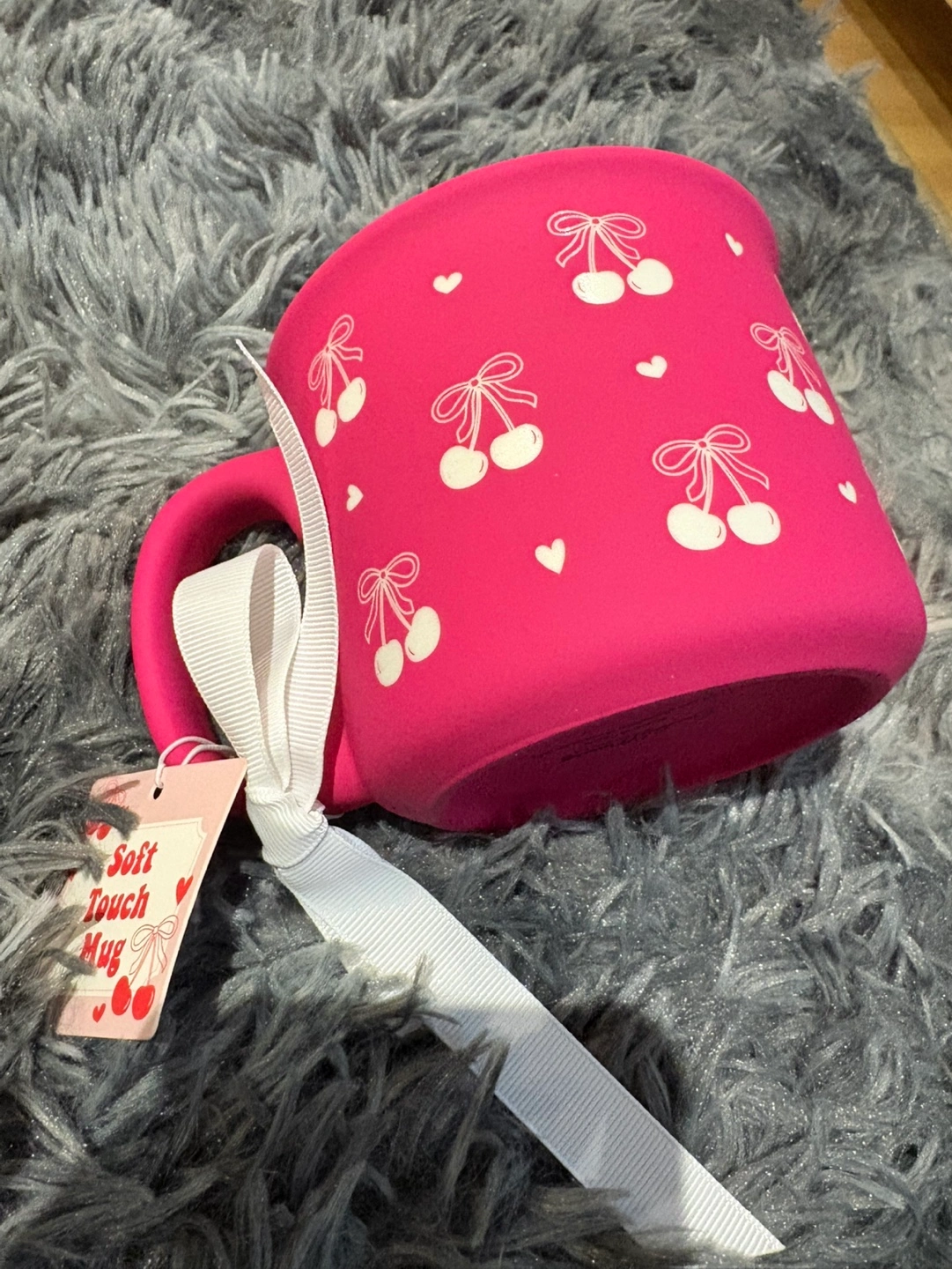 987Brandnew Cute pink mug. Features a cherry and heart design. Soft touch finish. Hand-wash only.