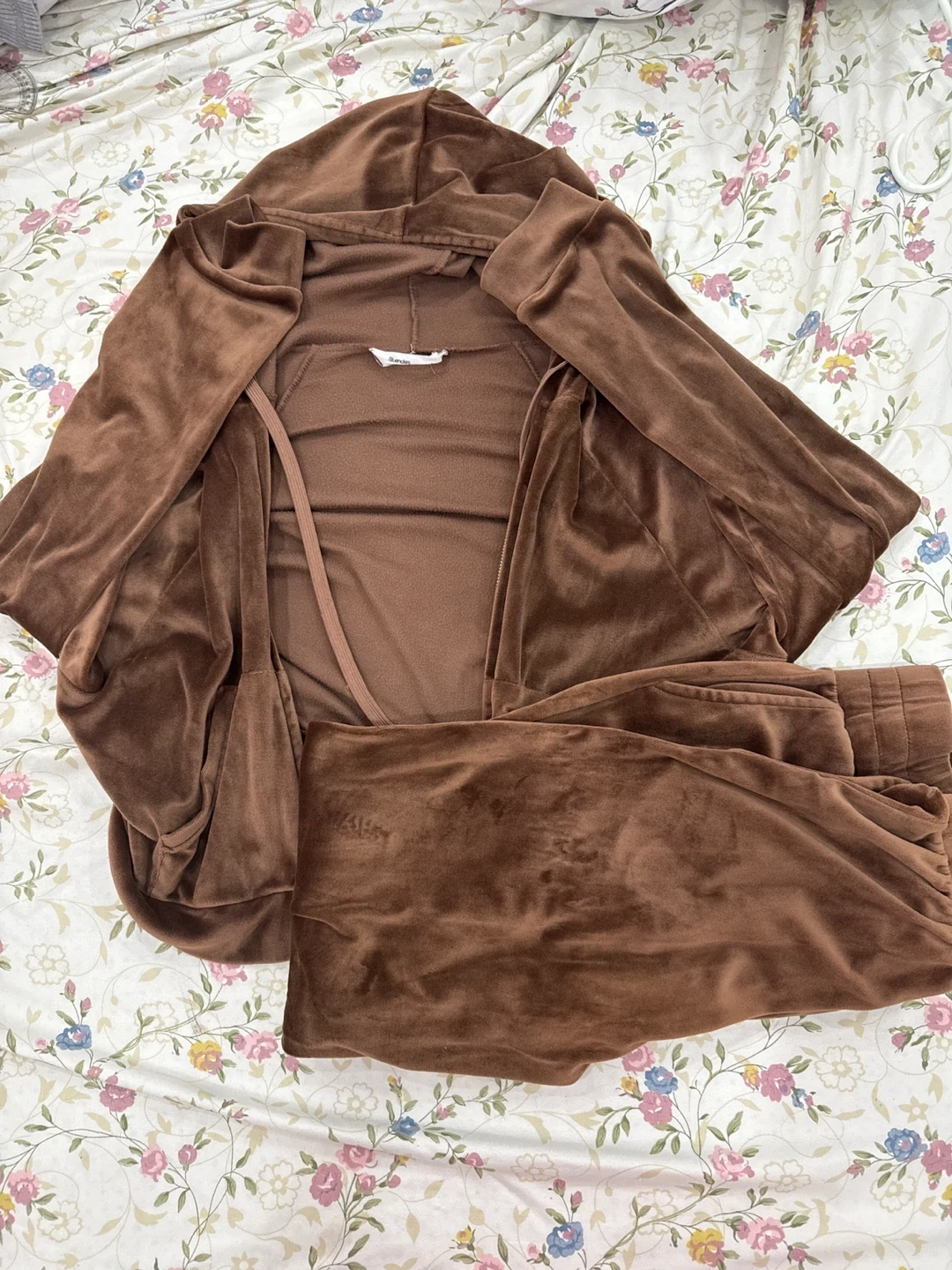10Selling a comfy Sundry brown velour tracksuit! It includes a hooded jacket and pants, perfect for lounging or running errands. The size is small.