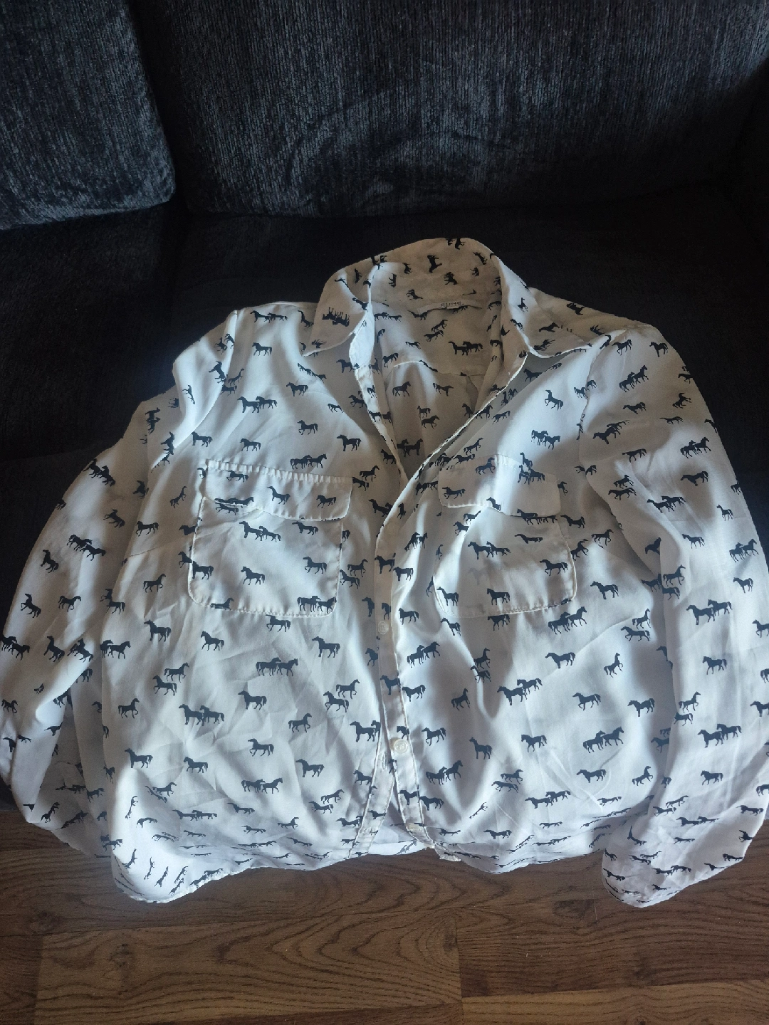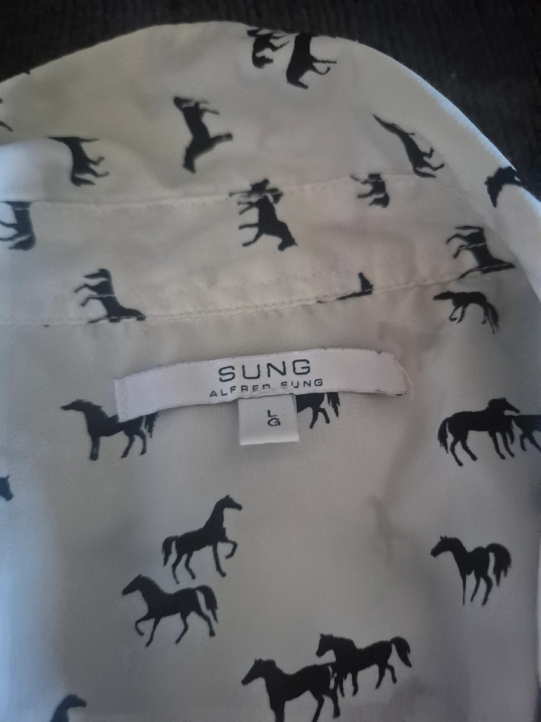10Here's a cute blouse from Alfred Sung! It's a size large and features a fun horse print on a white background. Perfect for adding a bit of personality to your wardrobe. Size ladies large. Used twice so like new. Asking $80
