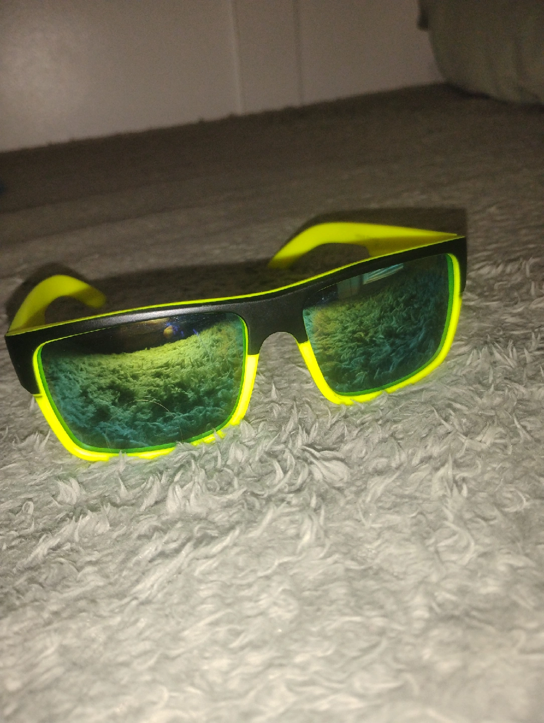 Selling a pair of sunglasses with a black frame and neon yellow accents. These sunglasses are in good condition and ready for a new owner!