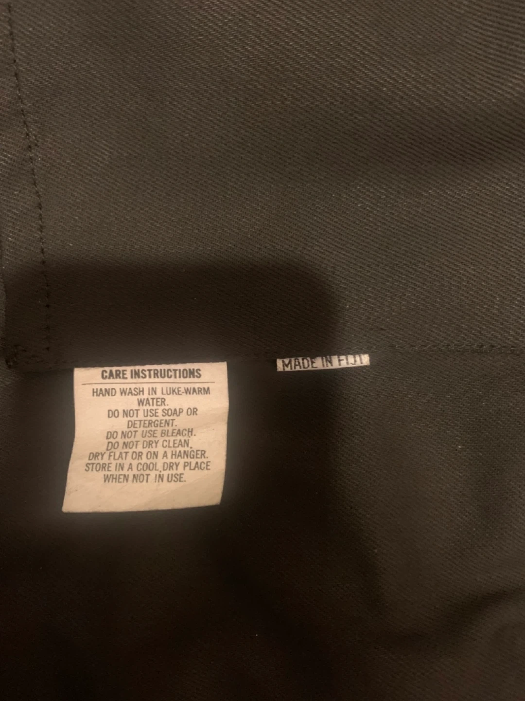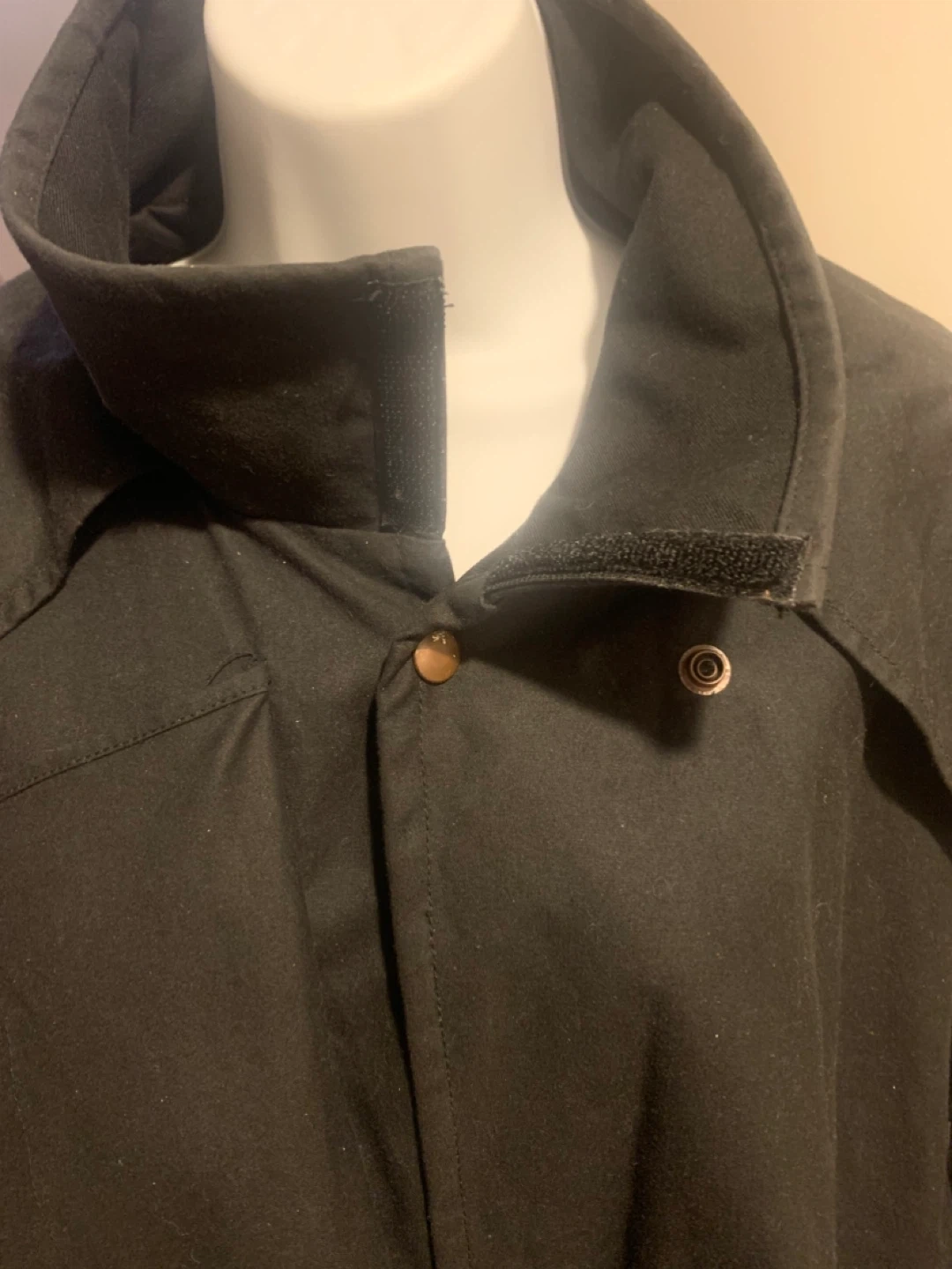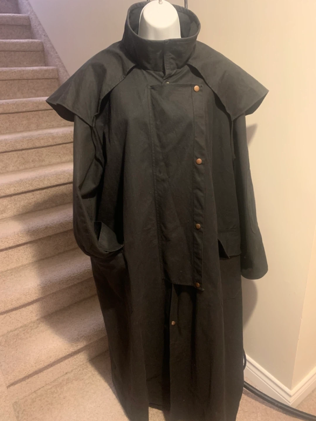 Black, long duster jacket made from 100% cotton oil skins. Features a full-length button-up front and a cape for added protection. Size 6.