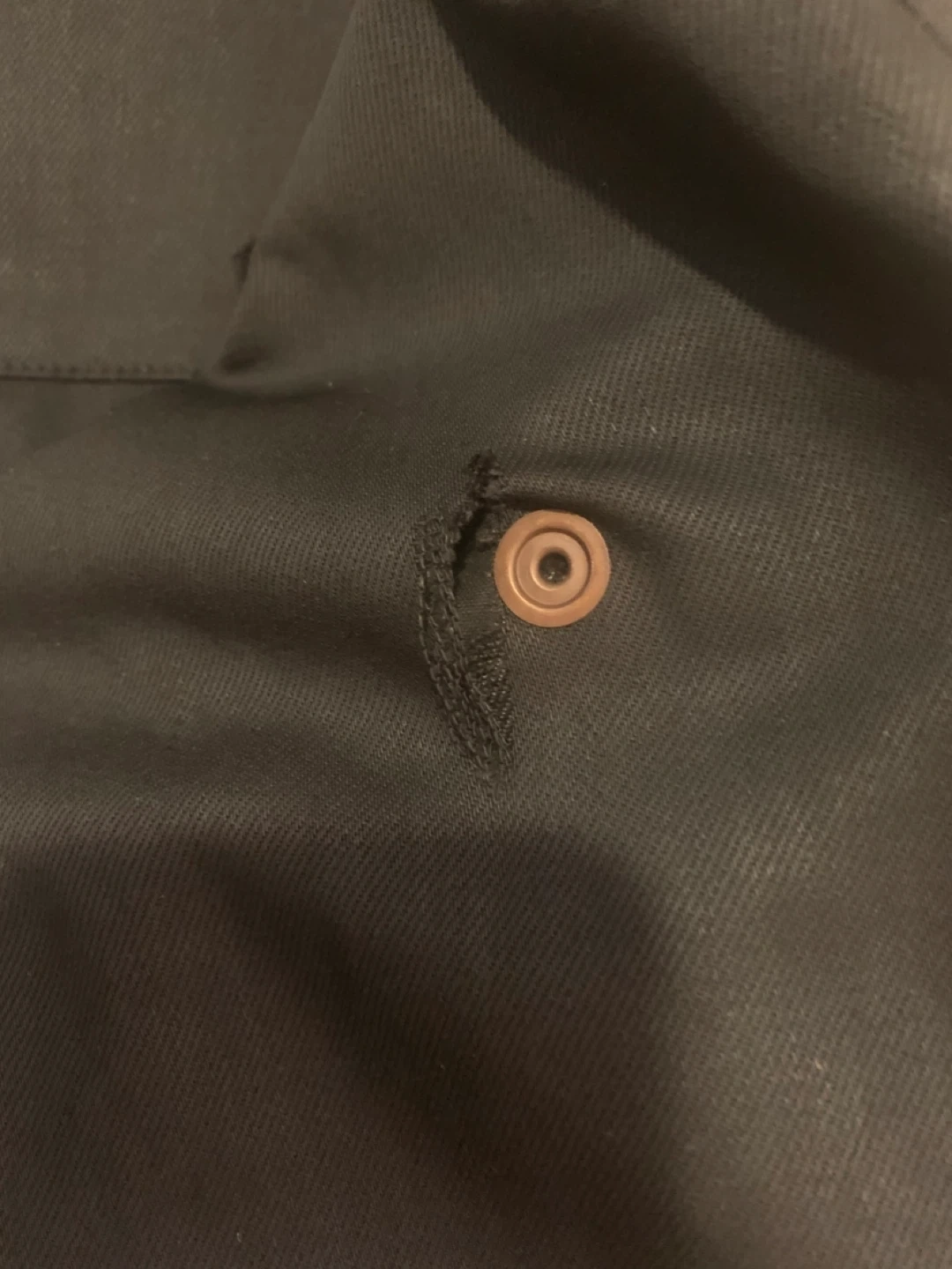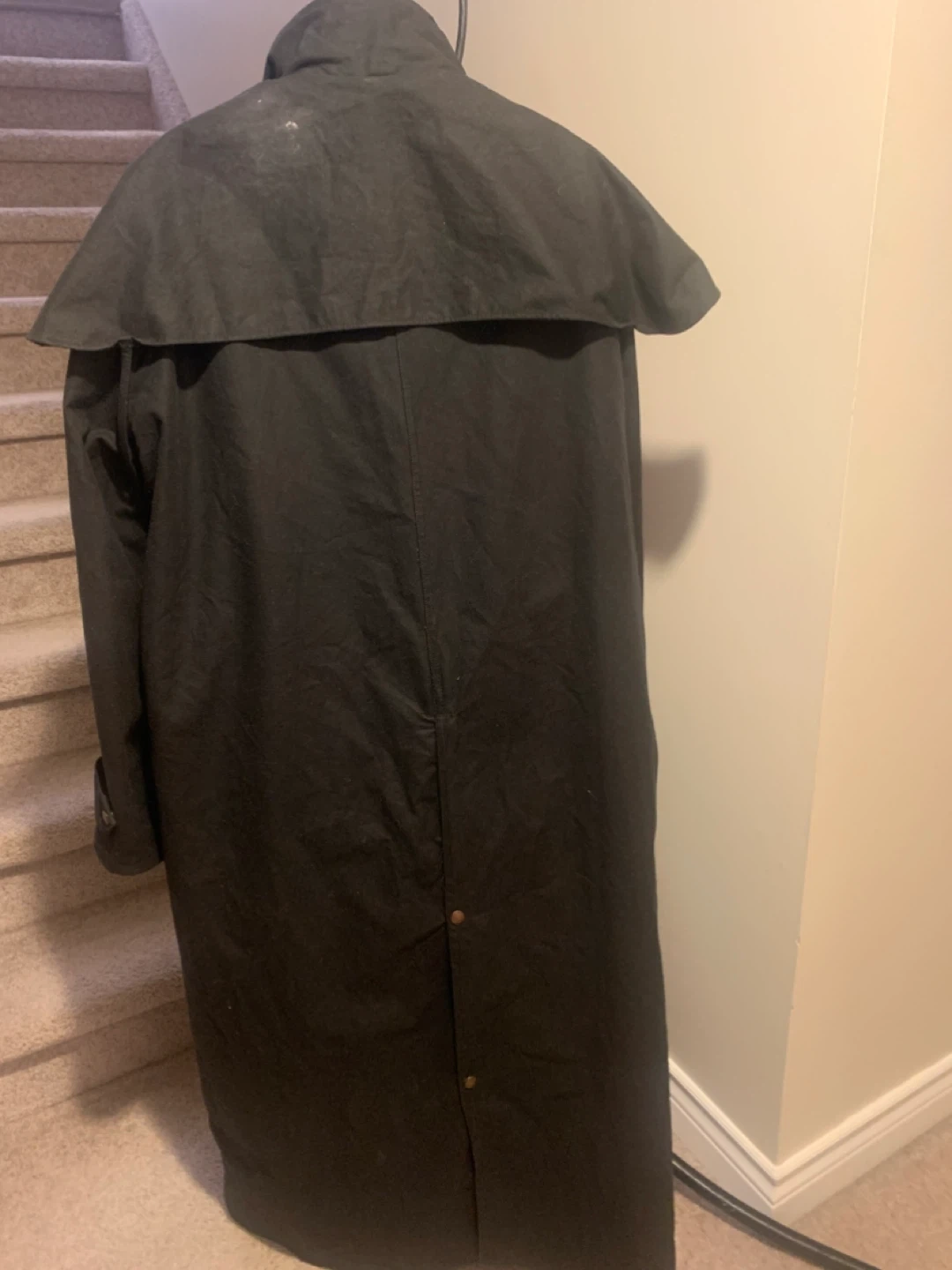 Black, long duster jacket made from 100% cotton oil skins. Features a full-length button-up front and a cape for added protection. Size 6.