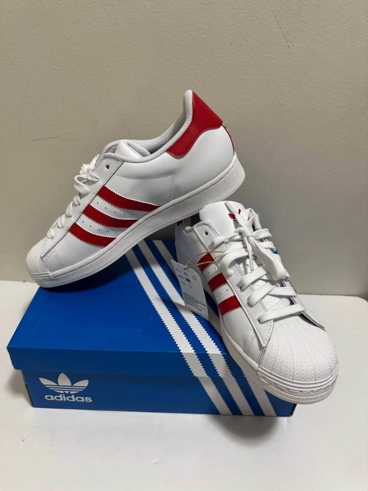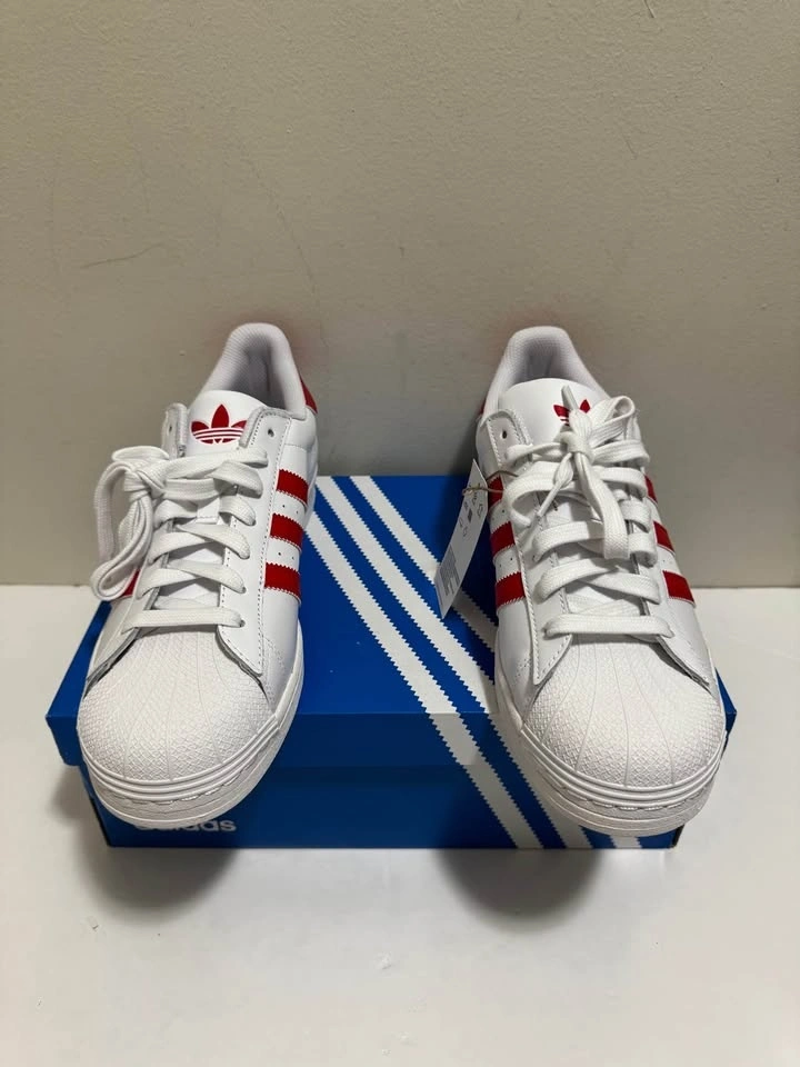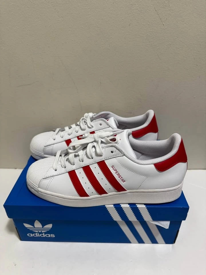 New Adidas Superstar sneakers. White with classic red stripes and heel tab. Still has the original tag on it. Comes with the blue Adidas box. Pick up only. Location: Close to Brampton Gateway Terminal and Shopper World Mall Brampton. When pick up time is scheduled and agreed, address will be provided. Cash only.