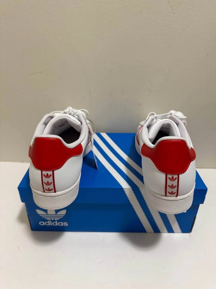 New Adidas Superstar sneakers. White with classic red stripes and heel tab. Still has the original tag on it. Comes with the blue Adidas box. Pick up only. Location: Close to Brampton Gateway Terminal and Shopper World Mall Brampton. When pick up time is scheduled and agreed, address will be provided. Cash only.