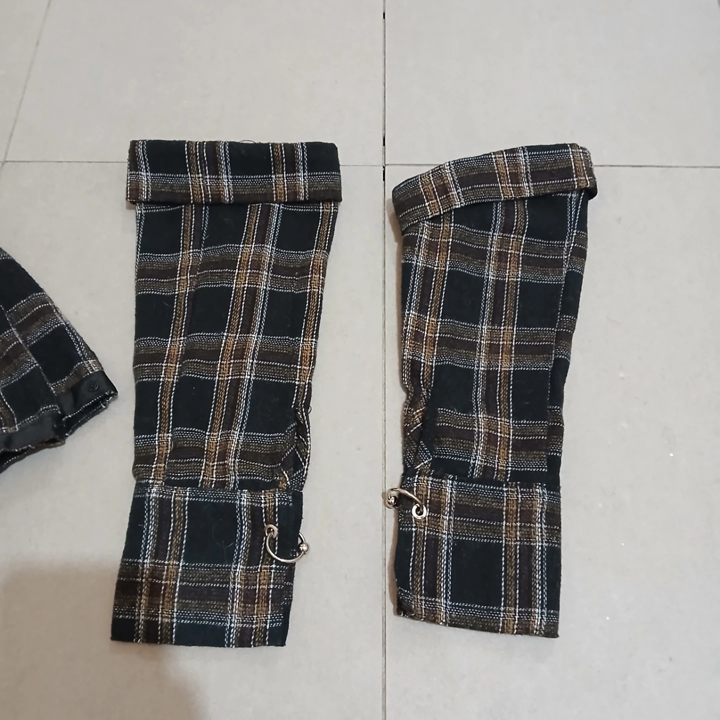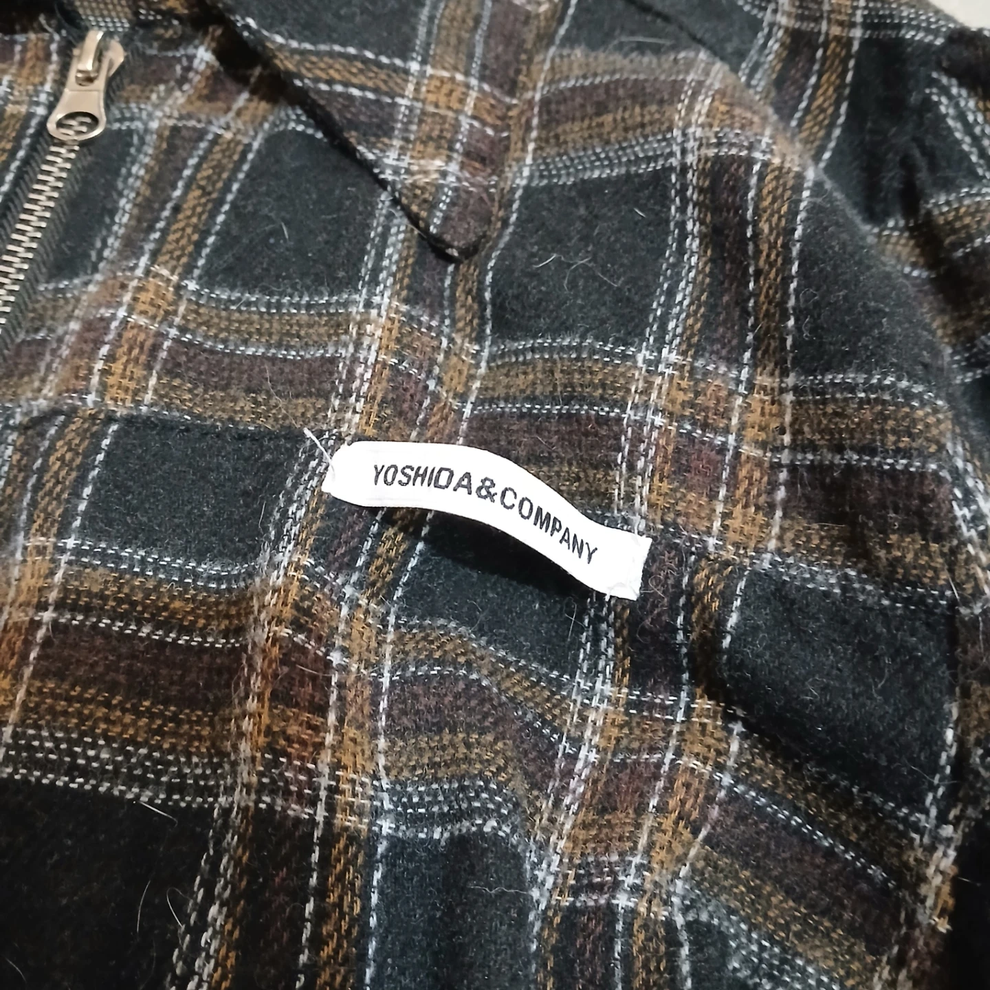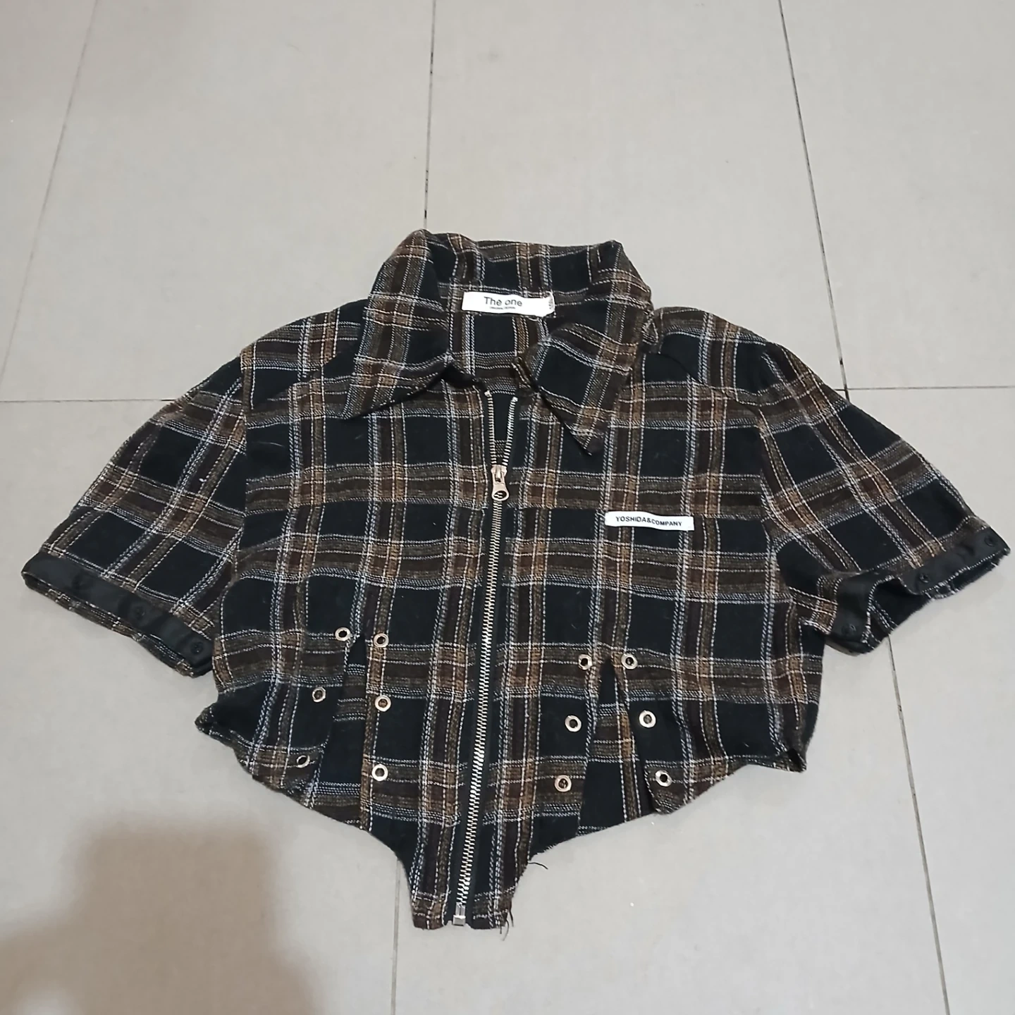 This cropped jacket features a black, brown, and white plaid pattern with a silver zipper. It has decorative eyelets along the hem and cuffs. Made by The One Original Design.