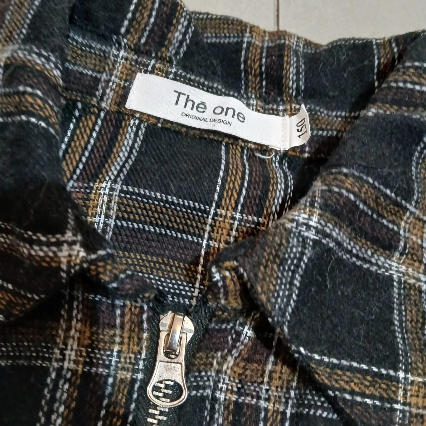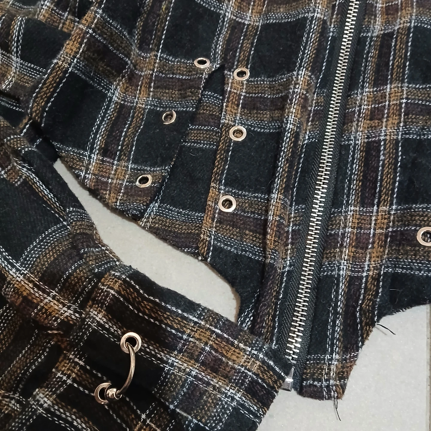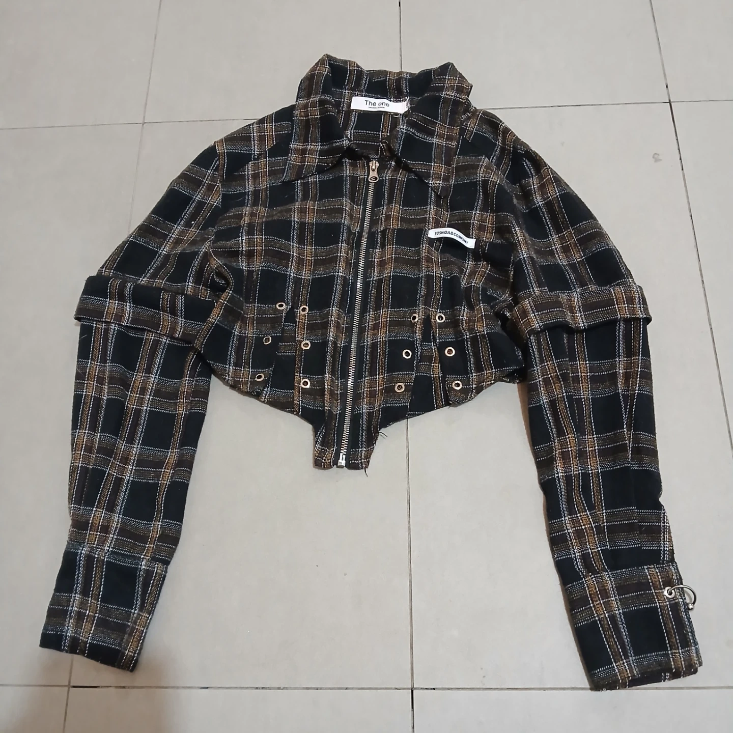 This cropped jacket features a black, brown, and white plaid pattern with a silver zipper. It has decorative eyelets along the hem and cuffs. Made by The One Original Design.