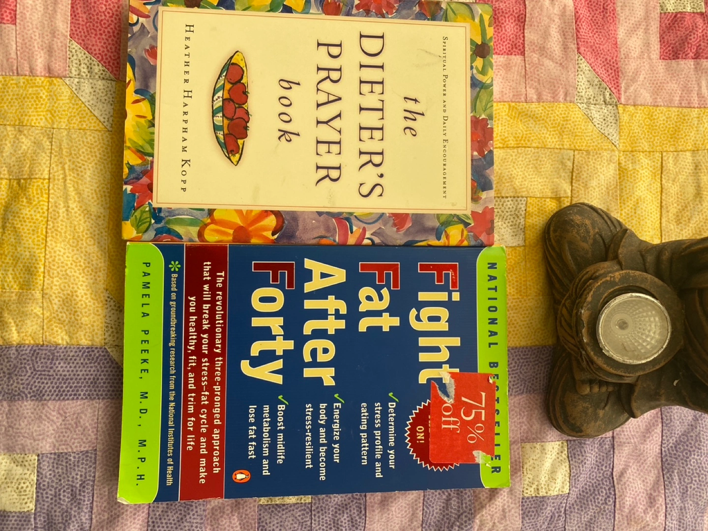 Collection of 2 items: Two used self-help books, one titled "The Dieter's Prayer Book" and the other titled "Fight Fat After Forty." 5 dollars each 2 for 8