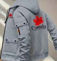 Grey hooded jacket with a red maple leaf and 'Canada' graphic on the back. It's got multiple pockets on the front and sleeves. This is a stylish outer layer.