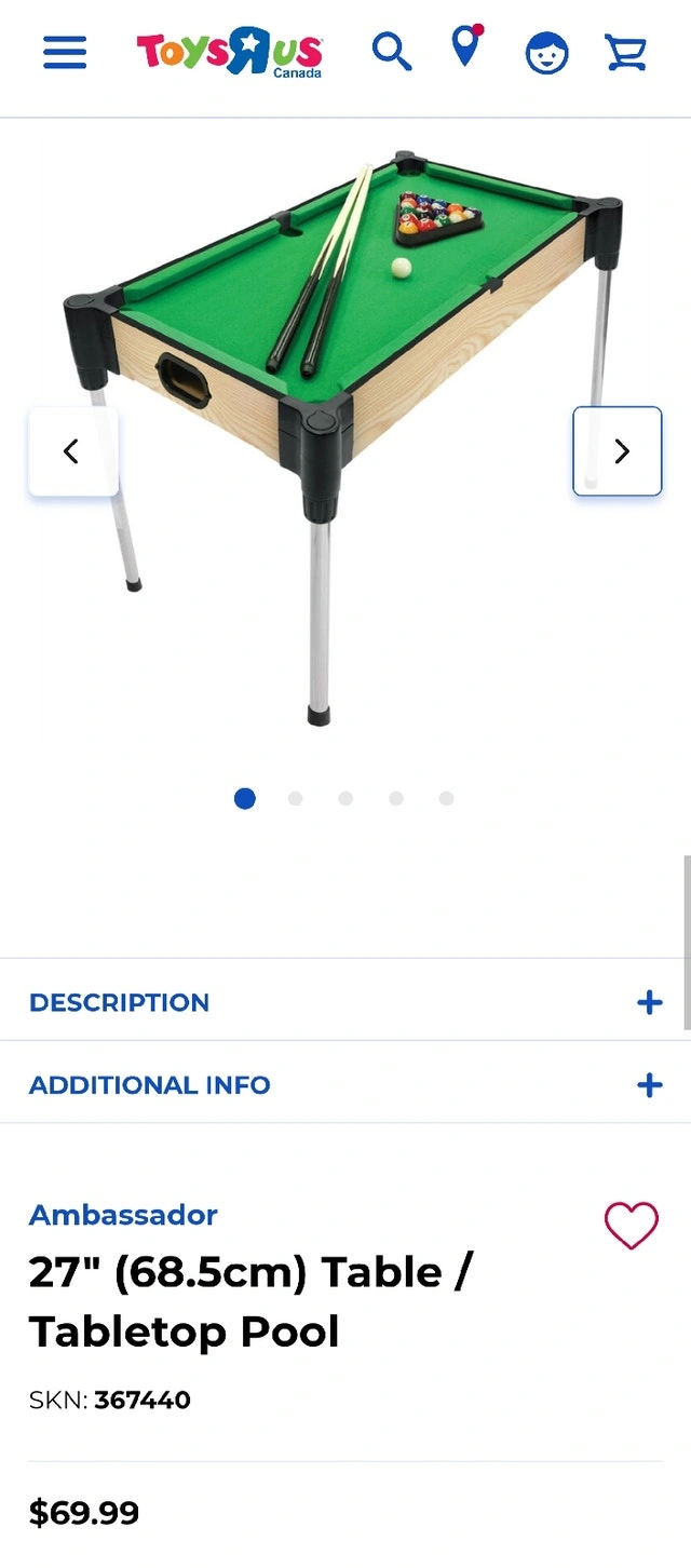 Brand new, unopened ToysRUs Canada Ambassador Games "Next Generation" 27" tabletop pool table. Patented design allows for quick, tool-free assembly in minutes. Features both table and tabletop playing modes, compact storage, and is stable and durable. Includes professional quality UREA balls, 2 wooden cues, and a triangle. Ideal height for kids. Simple set-up corner system, no tools needed. Removable and reversible steel legs. Space saving design. Assembled measurements: Height 62.5cm x Width 40.9cm x Length 72.9cm. Contents: 1 Wood pool table, 16 Billiards balls, 2 cues, 1 Triangle rack, Instructions.