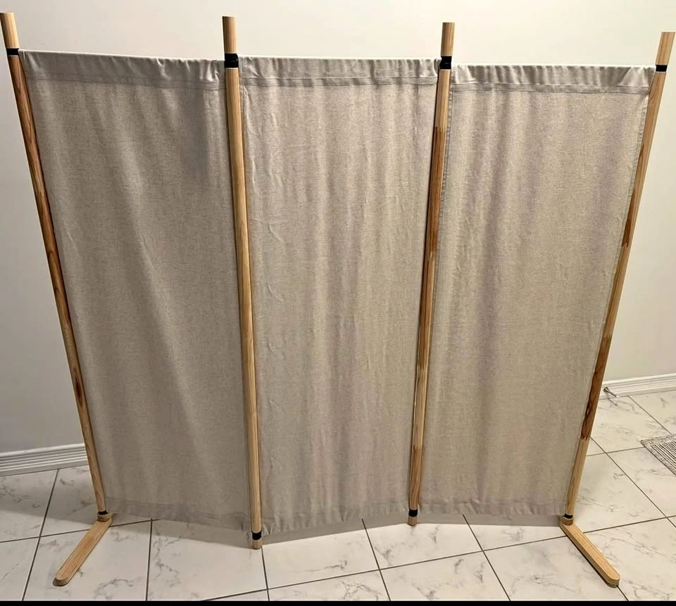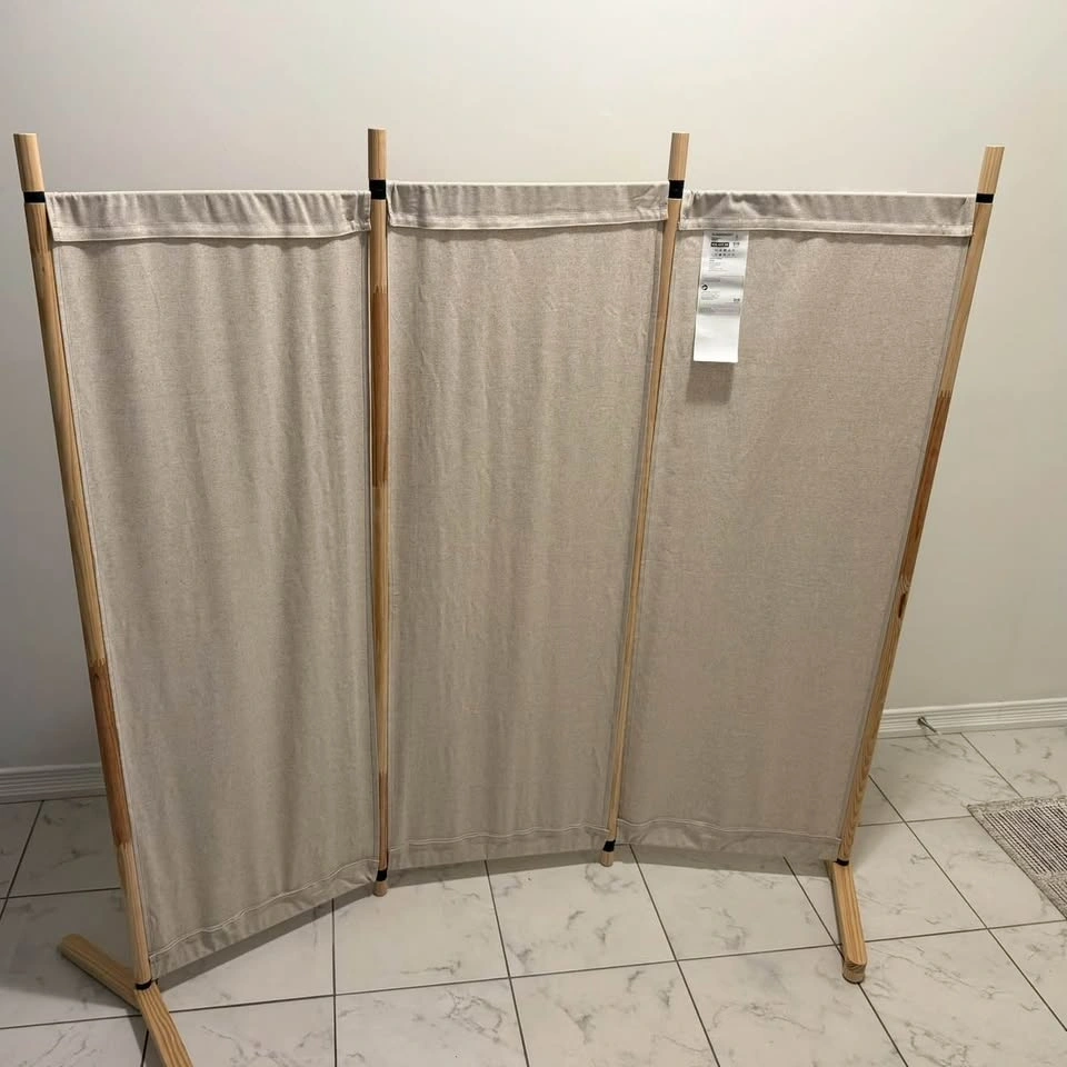 Create instant privacy or define your space with this modern, minimalist room divider. It features a solid pine wood frame with a neutral beige fabric that fits perfectly with any decor style. It’s lightweight, easy to move, and folds flat when not in use. Perfect for studio apartments, home offices, or hiding storage areas. Dimensions: 150 cm x 150 cm (59" x 59"). Materials: Natural pine wood and durable beige fabric. The fabric panels can be easily removed if needed. Retails at $130. It's already put together and ready to go for you.