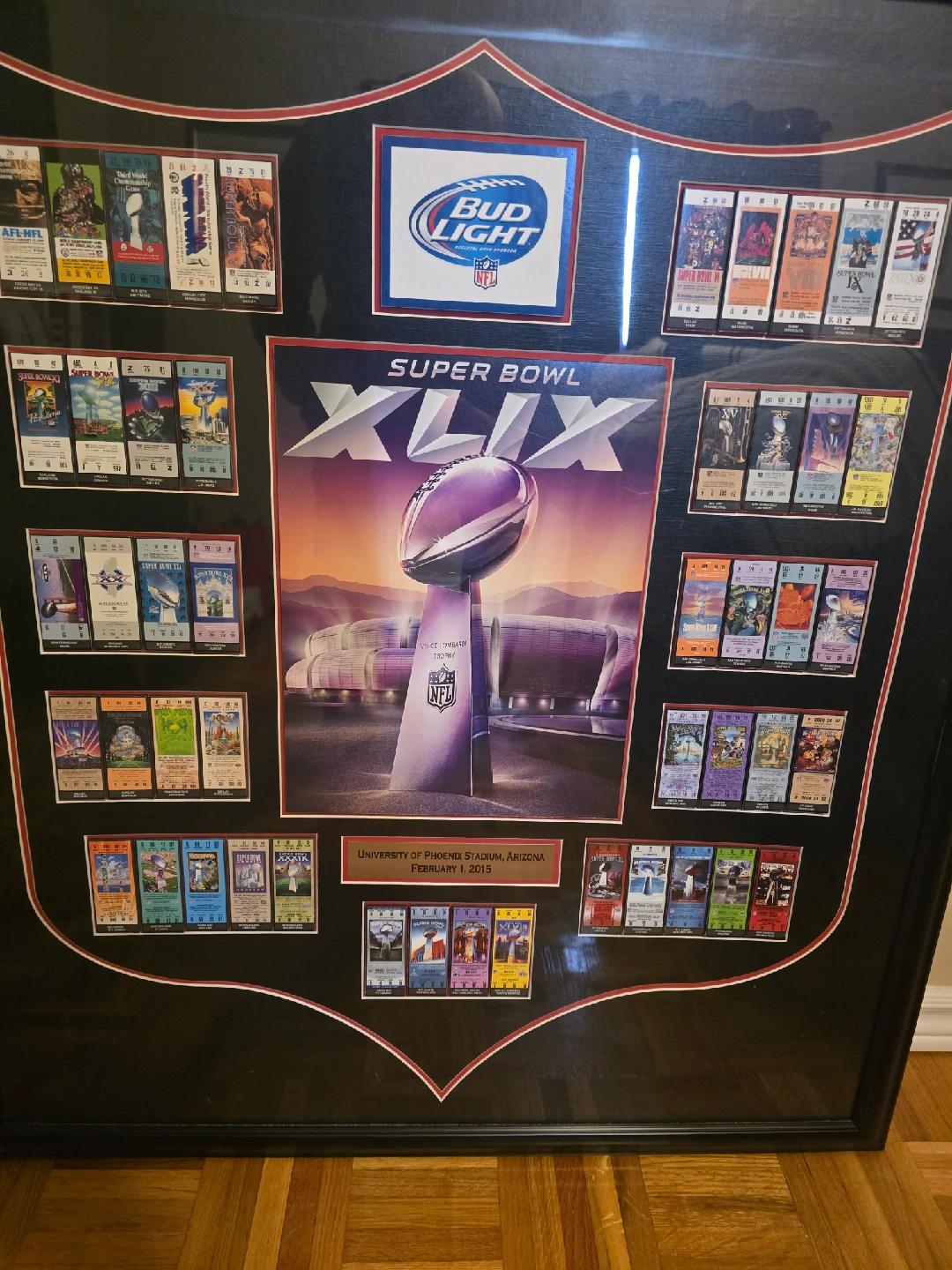 Selling a framed collection of Super Bowl tickets, including Super Bowl XLIX. The frame also features a Bud Light NFL logo. It's a cool piece for any football fan!